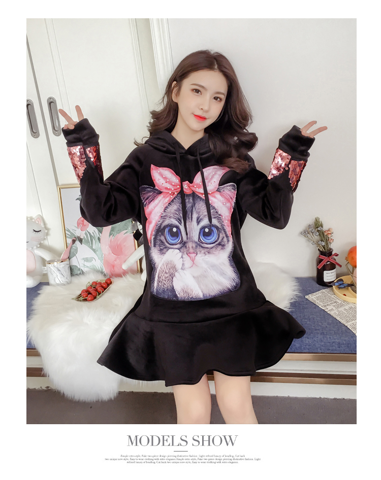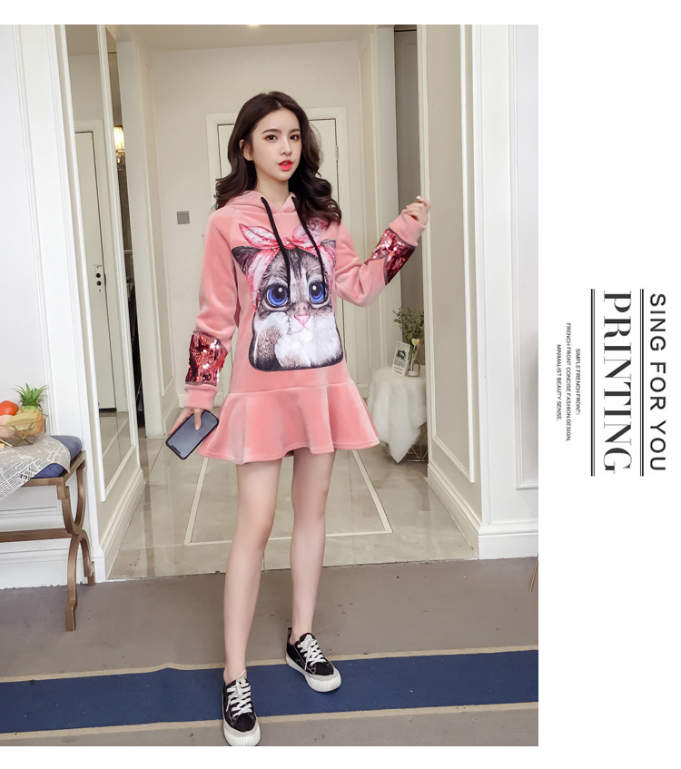 韓版潮流雙面金絲絨連帽衛衣女春秋中長款學生加絨加厚魚尾連衣裙1入
