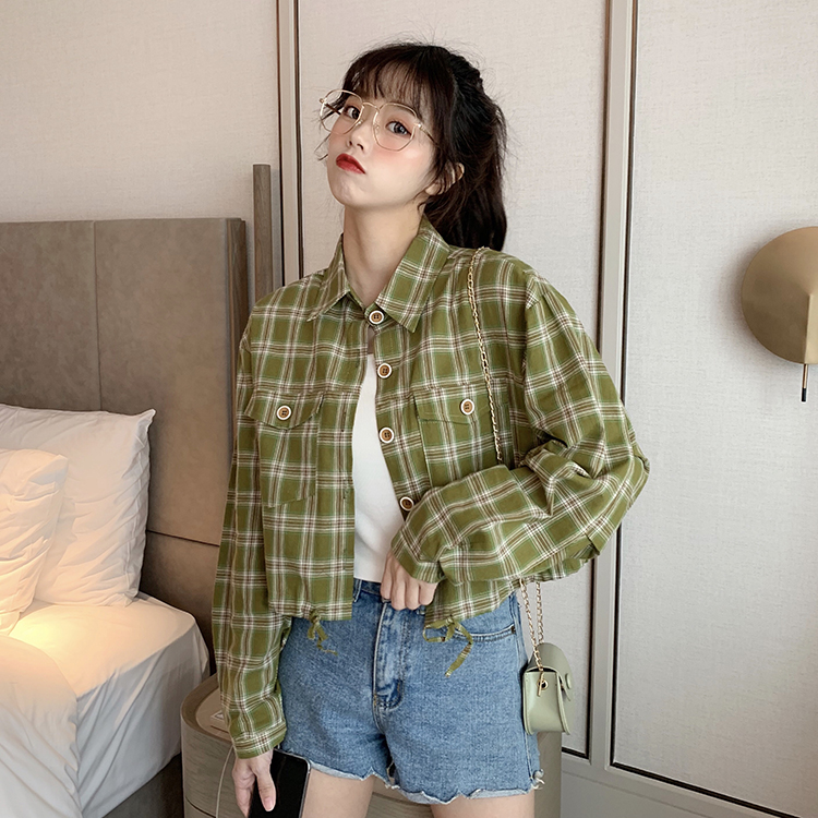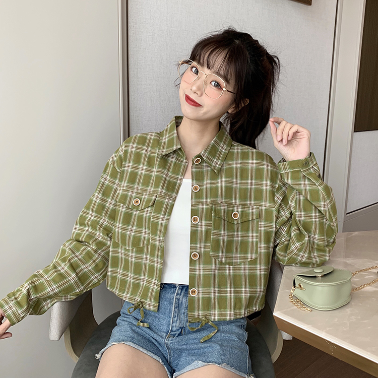 襯衫2019新款秋季 時尚兩件套裝女小背心T恤下擺抽繩洋氣格子衫1入