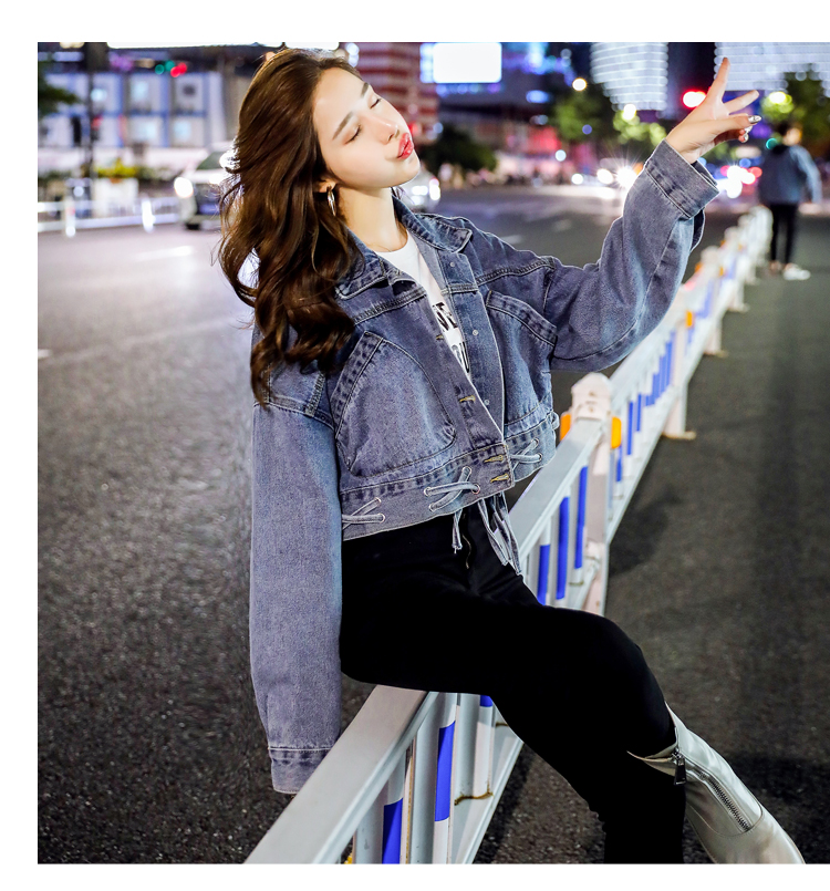 網紅時尚2019秋季新款洋氣下擺綁帶蝙蝠袖牛仔短外套女韓版寬松潮1入