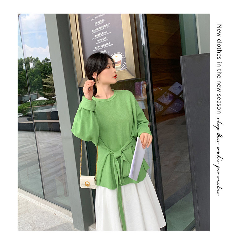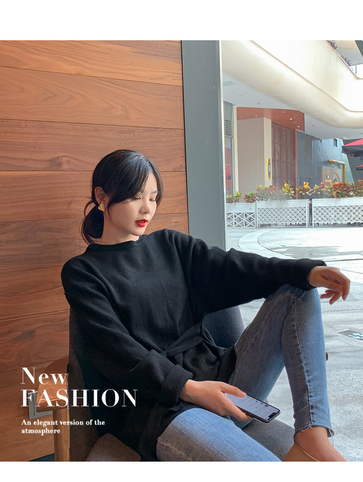 2019秋冬新款輕熟百搭純色針織衫女套頭毛衣腰部綁帶收腰氣質上衣1入