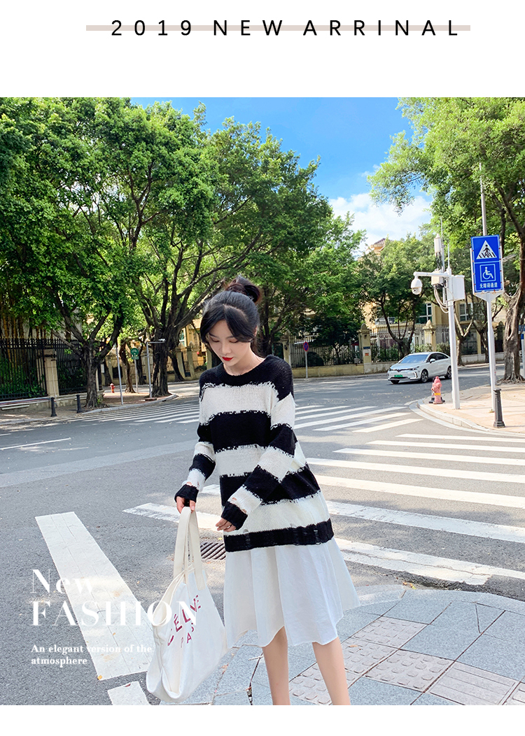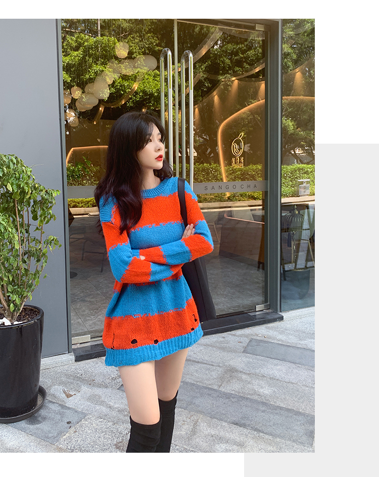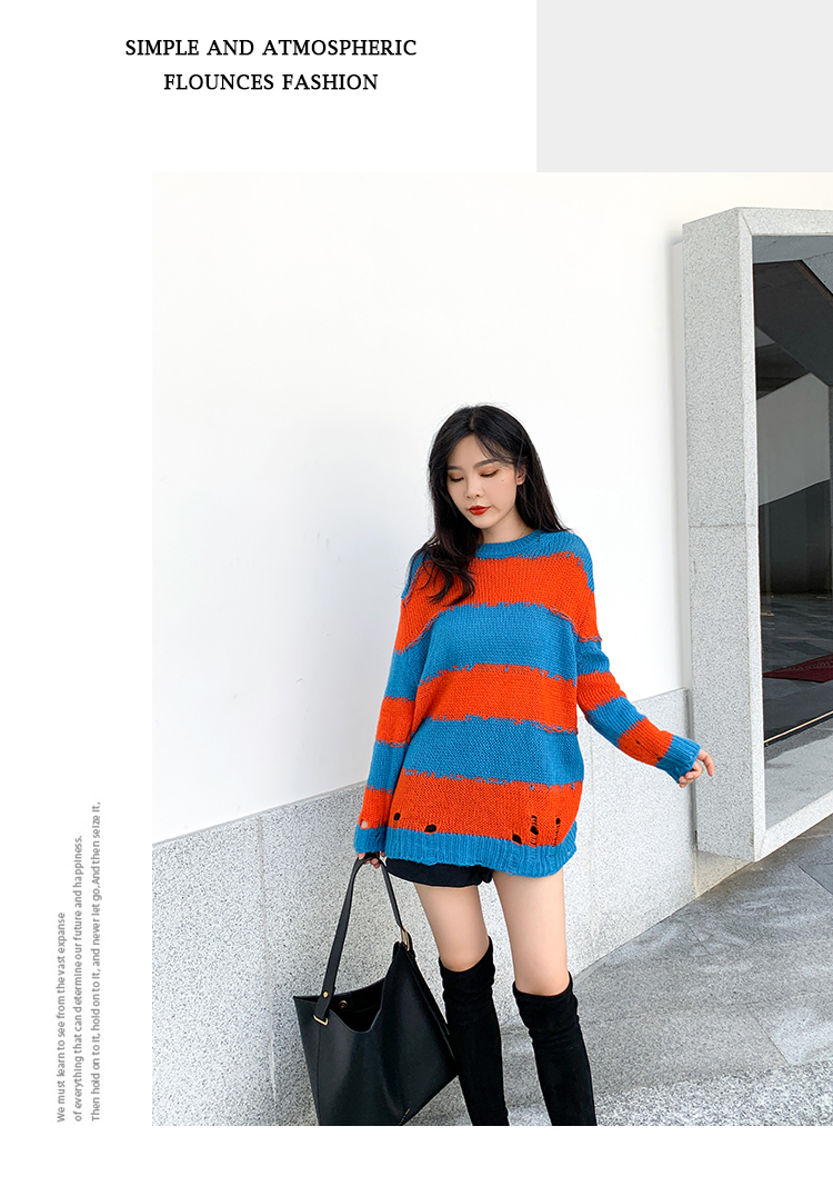 2019秋季新款鏤空彩虹條紋針織衫女薄款新款顯瘦拼色打底毛衣外穿1入