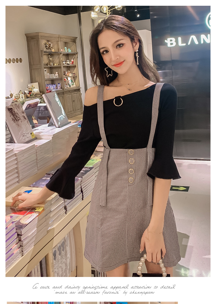 連衣裙秋新款2019兩件套法國小眾背帶套裝很仙的一字肩兩穿五分袖1入