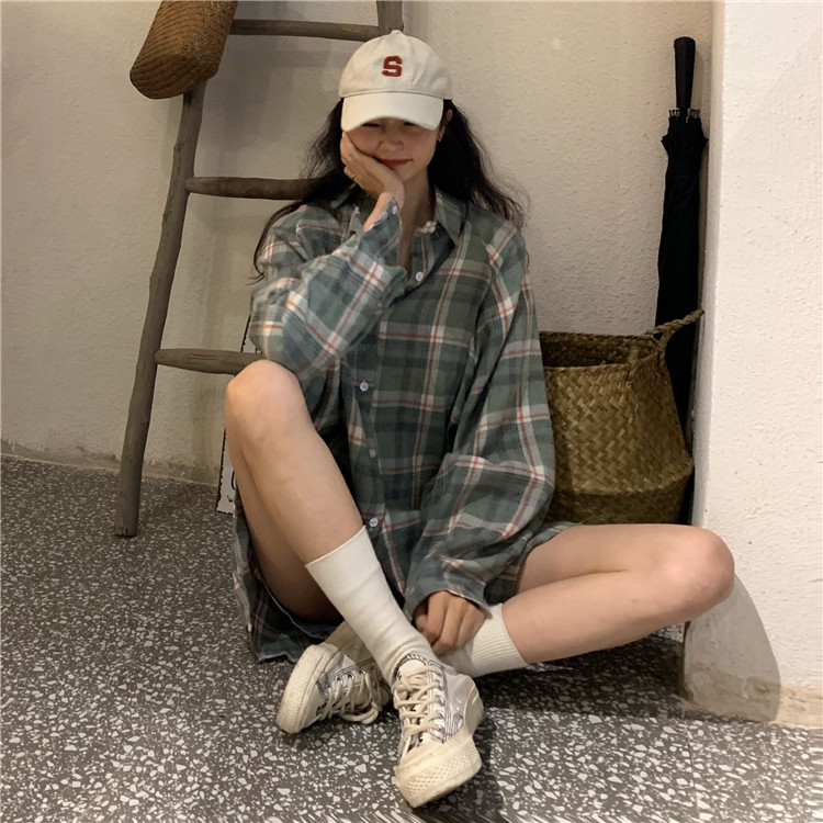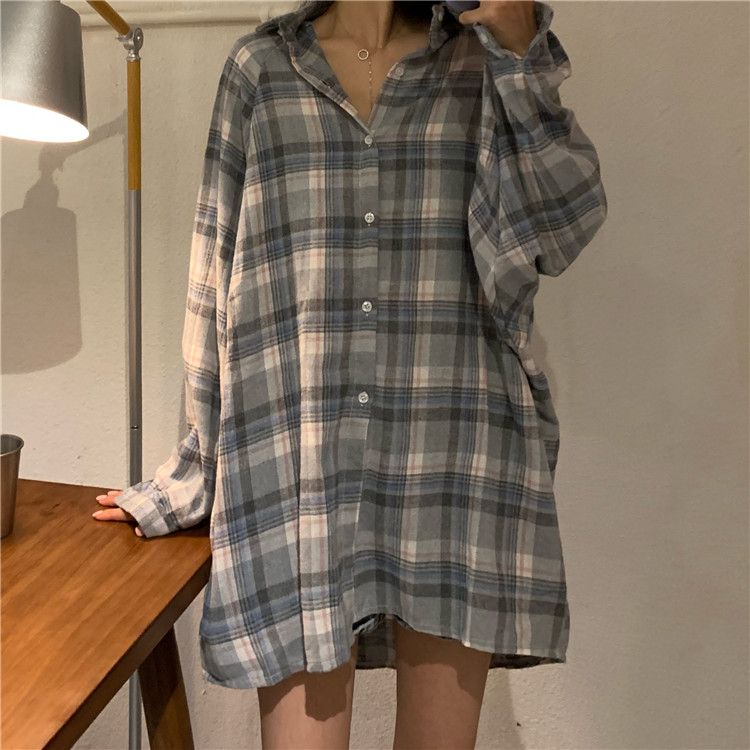 襯衫女2019新款秋季 韓版時尚潮流百搭氣質復古格子長袖學生上衣1入