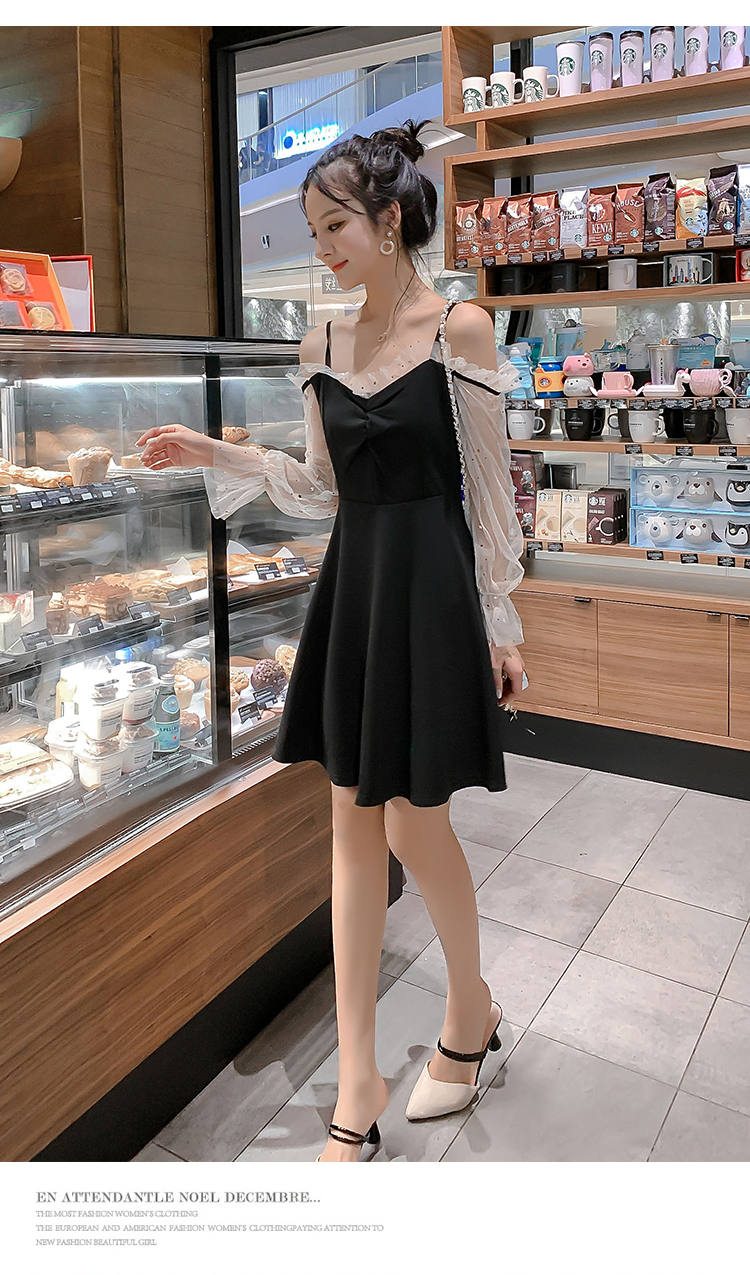 連衣裙2019年新款秋季 黑色禮服裙性感女裝氣質名媛網紗拼接顯瘦1入