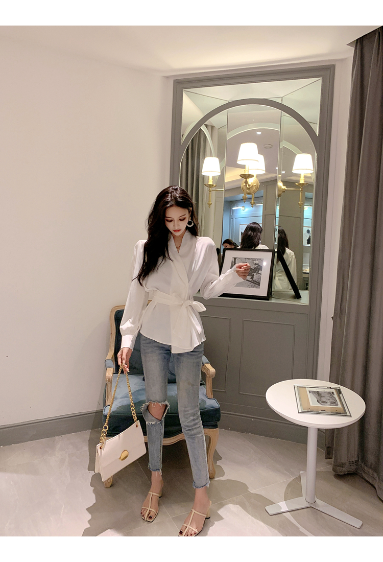 韓版純色收腰長袖小立領襯衫襯衣女2019秋季新款中長款休閑上衣女1入