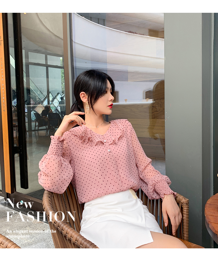 2019秋版新款長袖雪紡衫上衣女超仙的荷葉邊韓版時尚波點洋氣襯衫1入