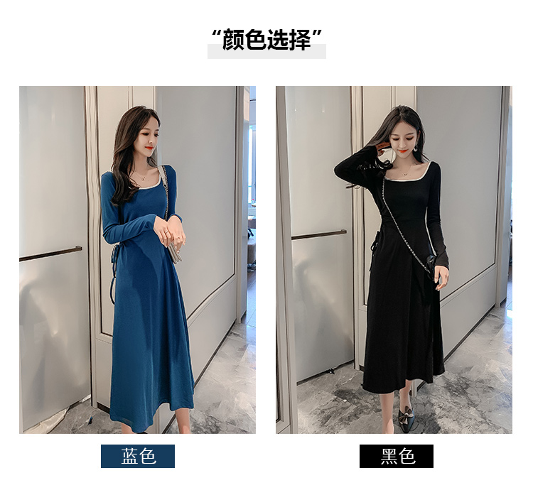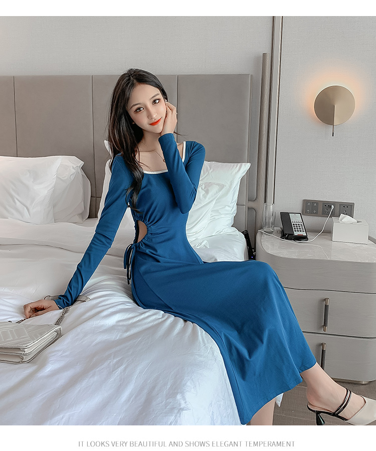 連衣裙2019新款秋季 時尚長袖收腰鏤空顯瘦方領設計中長款a字裙女1入