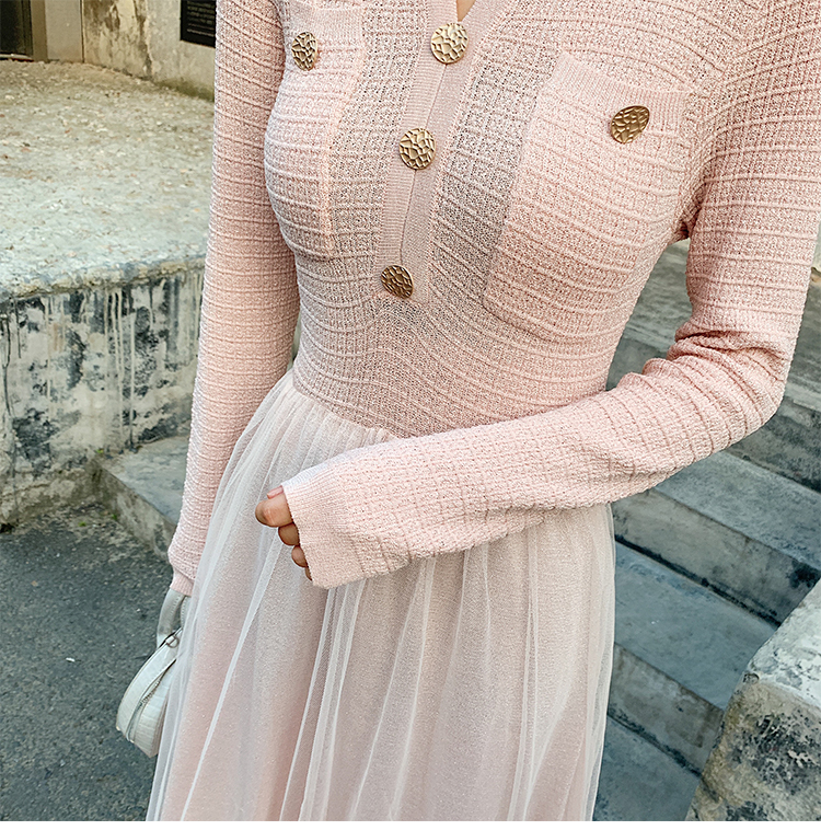 連衣裙2019新款秋季 亮晶打底針織拼接網紗紐扣女神氣質中長裙女1入