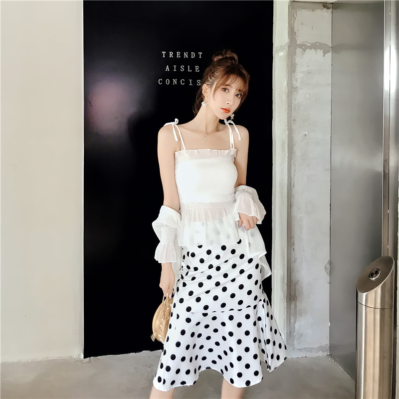 韓版新款時尚套裝女秋季開衫外套+系帶吊帶+開叉魚尾波點裙三件套1入