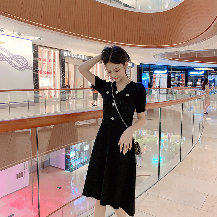2019韓版氣質夏季新款女裝V領連衣裙紐扣收腰顯瘦A字裙短袖小黑裙1入
