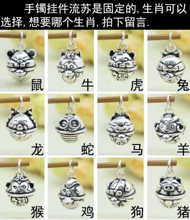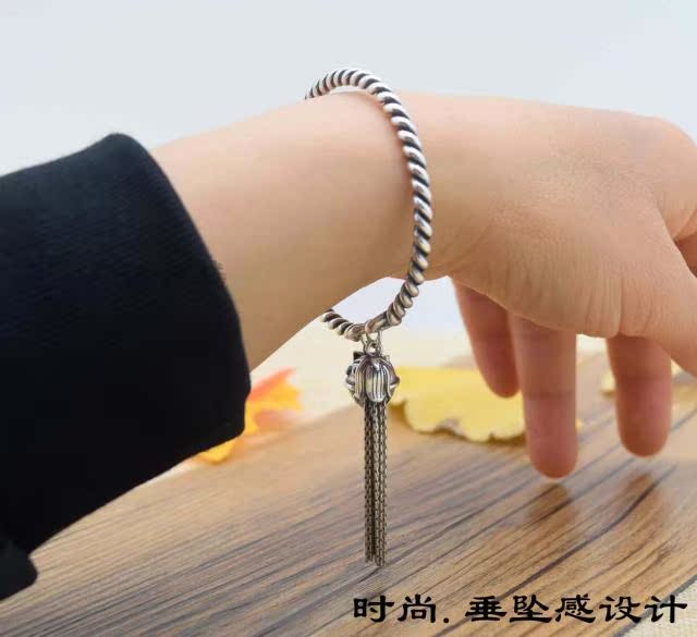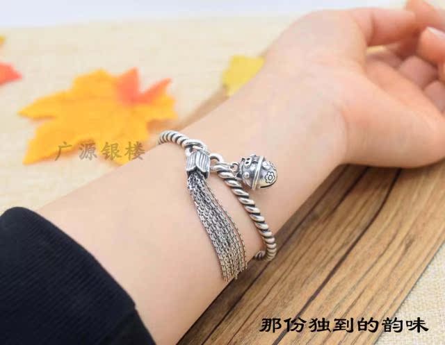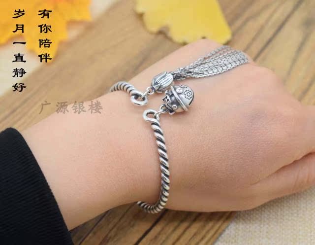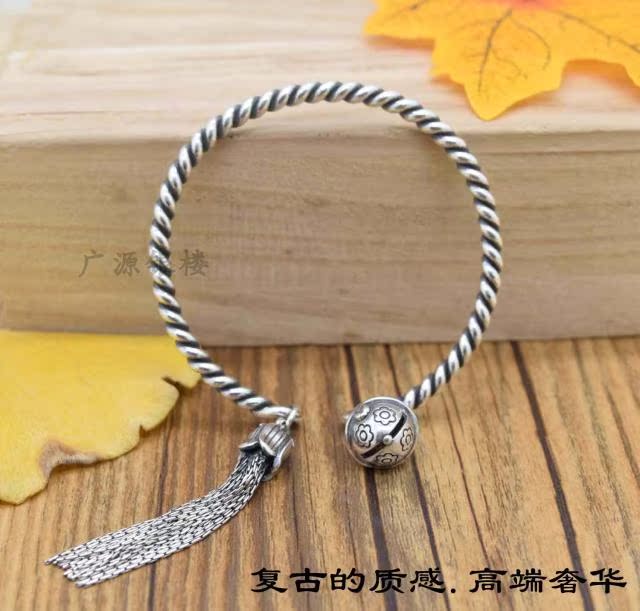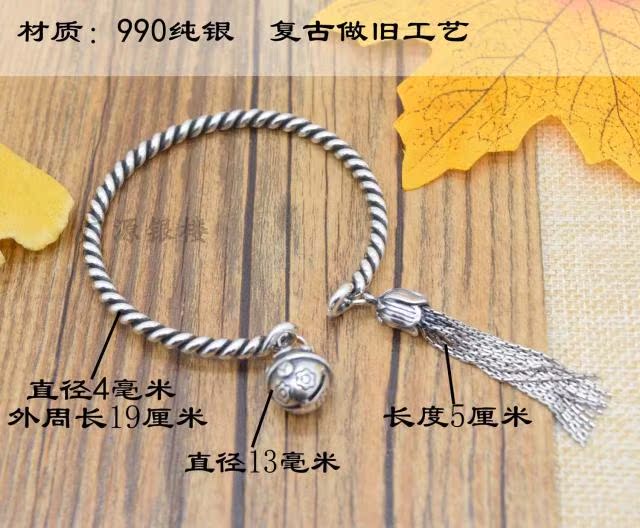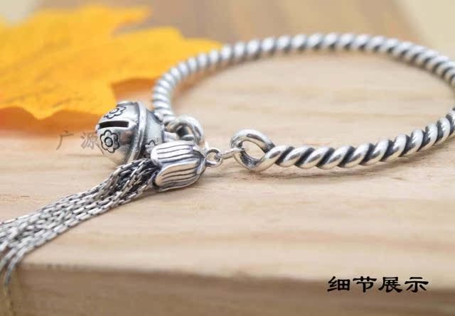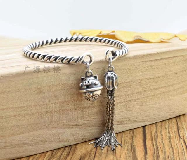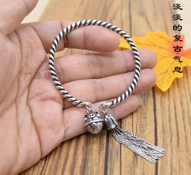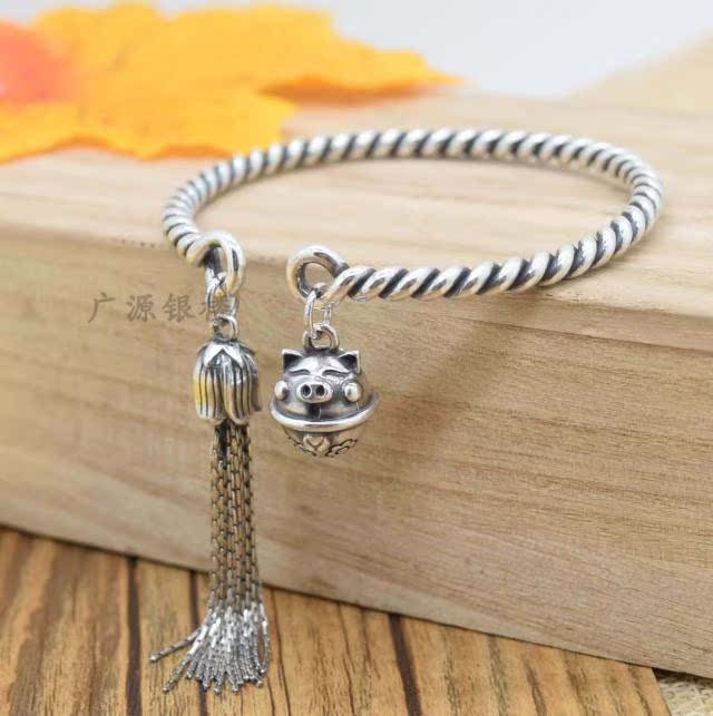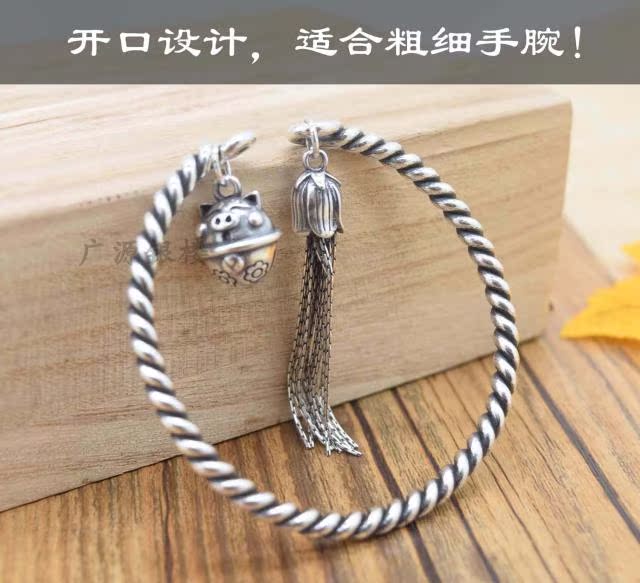 足銀999銀鐲子開口麻花手鐲女復古民族風流蘇旺財豬鐲子鈴送女友1入