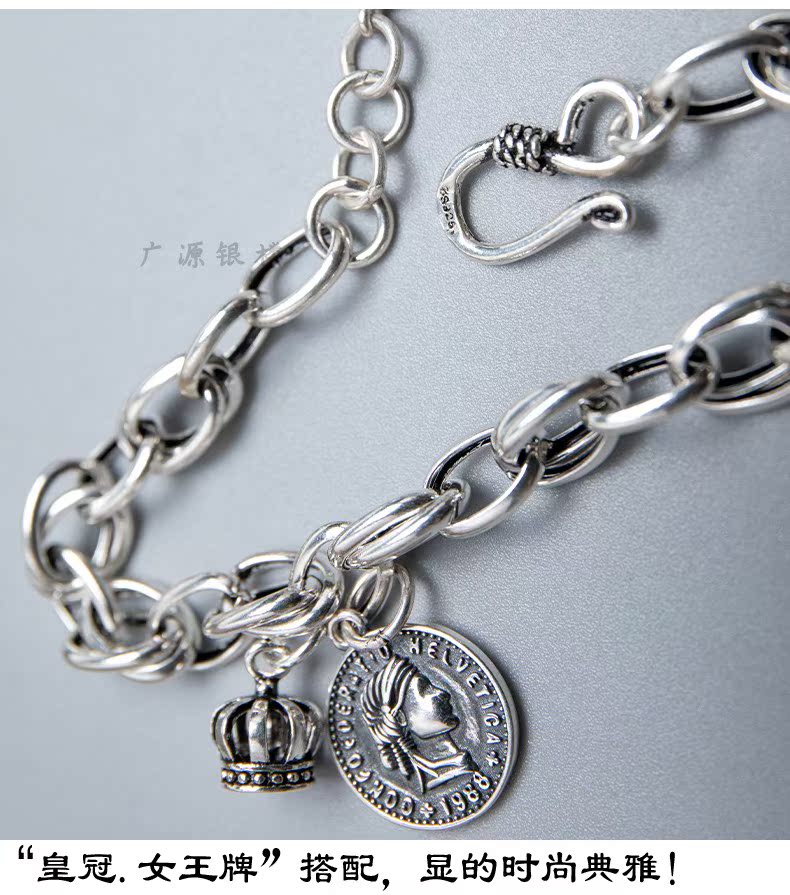 韓國S925純銀手鏈伊麗莎白硬幣吊墜個性時尚女歐美潮流學生粗生日1入