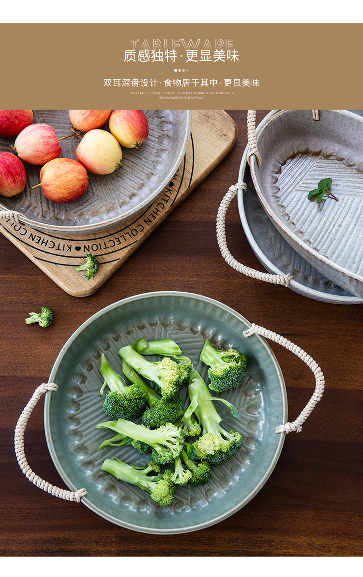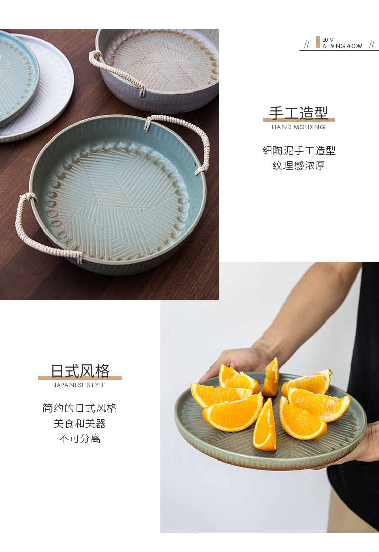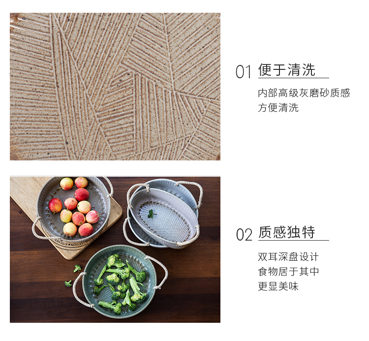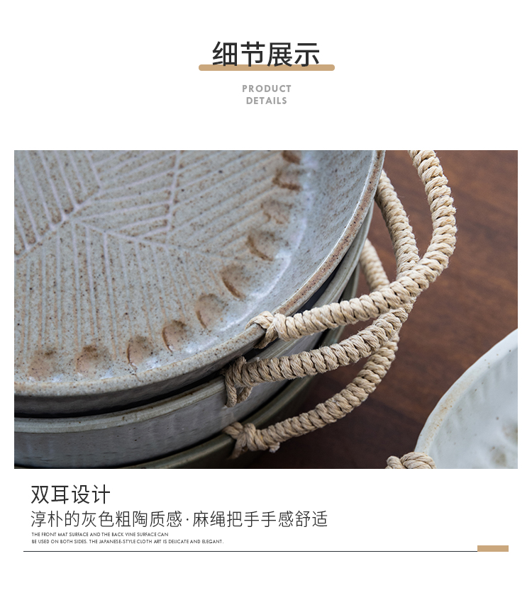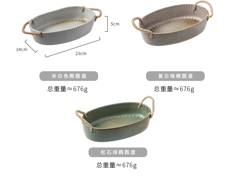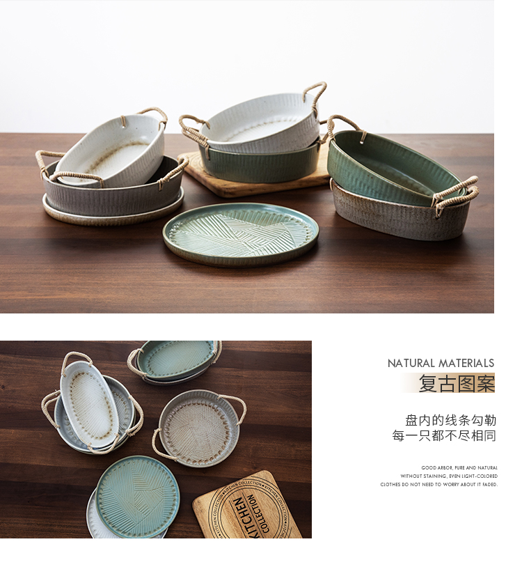 米立風物復古粗陶麻繩把手橢圓盤點心盤果盤擺拍盤子北歐早餐盤1入