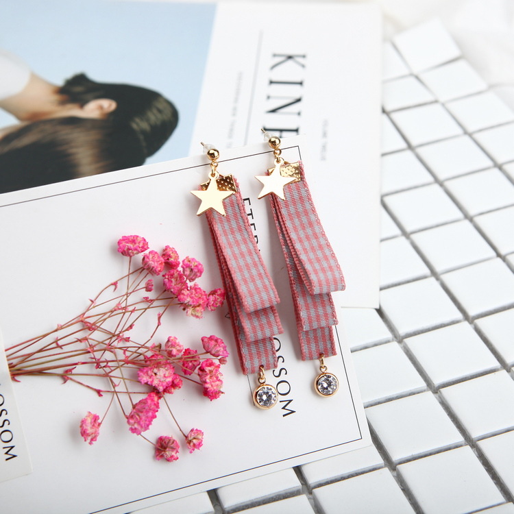 韓國飾品個性格子星星布條布藝耳環耳環 女絲帶長款流蘇耳飾1入