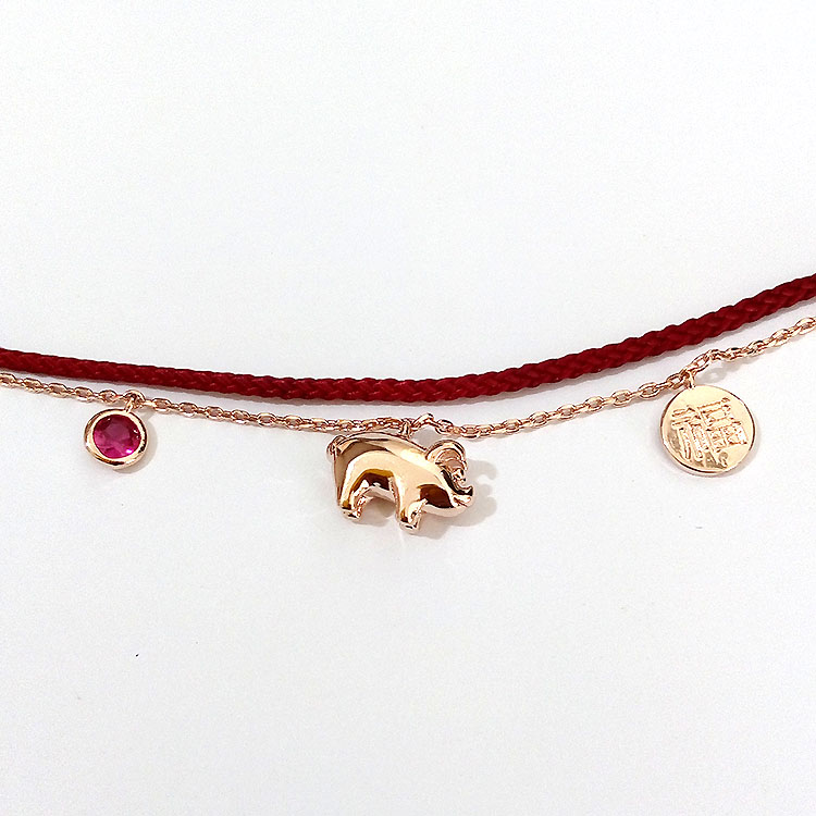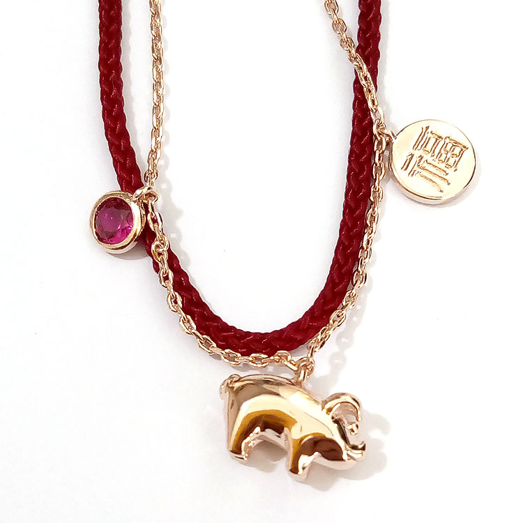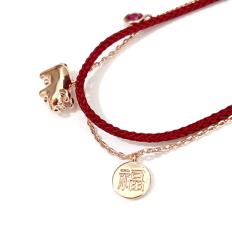 鍍真金小豬玫紅水鉆福字豬年本命年轉運紅繩女式手鏈手鐲1入