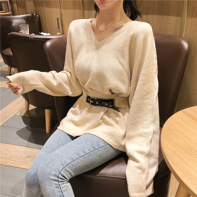[2]性感一字領露肩韓版長袖時尚V領寬松毛衣百搭腰帶長袖針織衫上衣1入