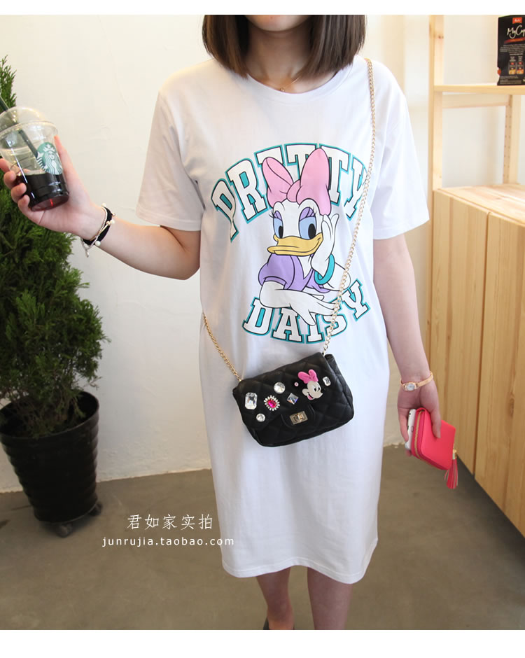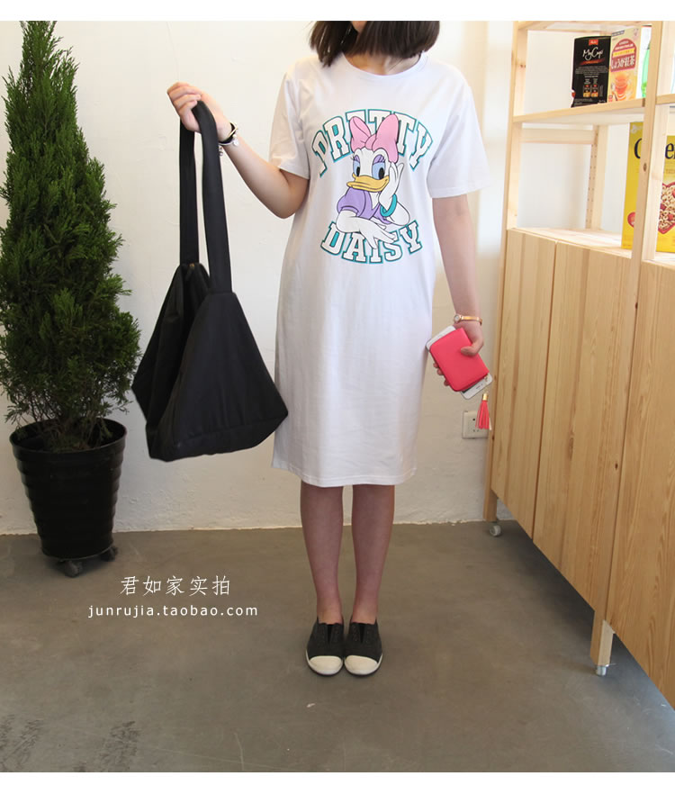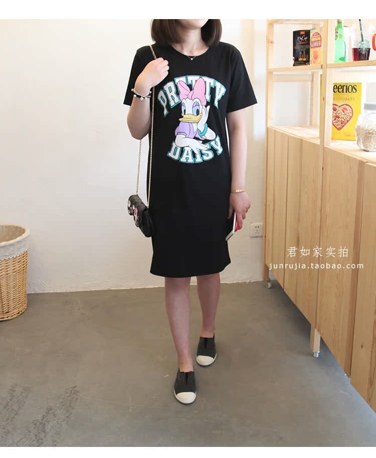 君如家原創自制 100%純棉面料 環保健康,柔和親膚,舒適透氣,不掉色,不起球,不變形 非常顯瘦的長款T裙,長度在95CM左右,完全可以當裙穿哦! 可愛黛西圖案印花配色清新 非常惹人愛, 面料成分是100%全棉,厚薄適中,不會很厚,夏天穿不熱 我們獨家定制的面料,黑色面料為活性黑,非硫化黑,非常環保 印花為環保水印,GA型涂料,嬰幼兒級別,無異味,不掉色。 尺碼做的很全,90斤到180斤都可以穿。黑 白 灰 三色隨心搭配 下圖為君如家100%實拍, 模特身高1.68米 體重90斤,為了寬松效果選的M , 實際選S合身點