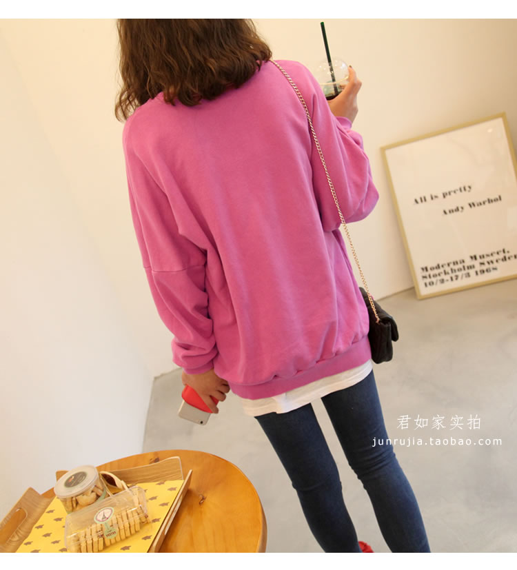 君如家原創自制! 這款玫粉色 衛衣讓人眼前一亮,特別提升心情! 目前有 春季純棉無絨款 和 冬季加絨加厚版兩個版本 冬季加絨加厚版里面加了一層薄棉里襯可以防止掉絨,同時更加親膚 不會產生靜電等~ 面料表層是純棉的不會起球,質感親柔。 君如家重品質,特別是孕婦產品我們非常重視產品的環保舒適度。 做了三個尺碼,胖瘦都可以穿,孕婦非孕婦都可以穿。 衣長70CM左右 可蓋過屁股 孕婦穿也不短的 這款版型是蝙蝠袖的,所以大家尺碼參考腹圍吧,大家按尺碼表推薦體重購買就可以。 下圖為君如家模特100%實拍,模特身高1.70米 體重90斤 穿的L號寬松效果。 這款不是假2件 里面白色的T是不附帶的, 大家可以單獨到這個連接買白色長袖T https://item.taobao.com/item.htm?id=538121101583