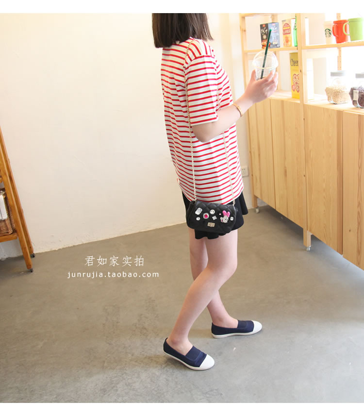君如家原創自制 這款條紋T 超級百搭 實用 ,上身洋氣韓范 胸口小米奇印花又不失可愛 這個面料超贊,采用經典 95%精梳棉和5%彈力纖維面料, 在純棉面料里加5%的彈力纖維 可以在保留純棉面料 親膚透氣 不起球等特性的同時 讓面料更不易變形 質感更加細膩順滑 長度是常規款,適合搭配 牛仔短褲 短裙 等,其他季節內搭也很棒。 做了3個尺碼,覆蓋體重90斤到200斤,孕婦和非孕婦都可以穿。 下圖為君如家模特100%實拍 模特身高1.70米 體重90斤,穿的M號寬松效果。 2016-6-26新增加黑白條