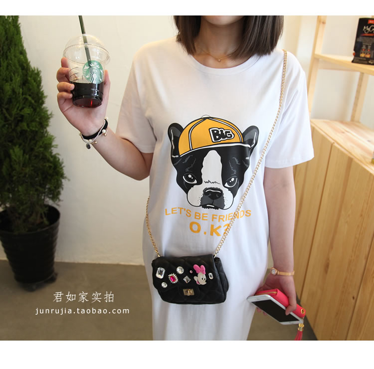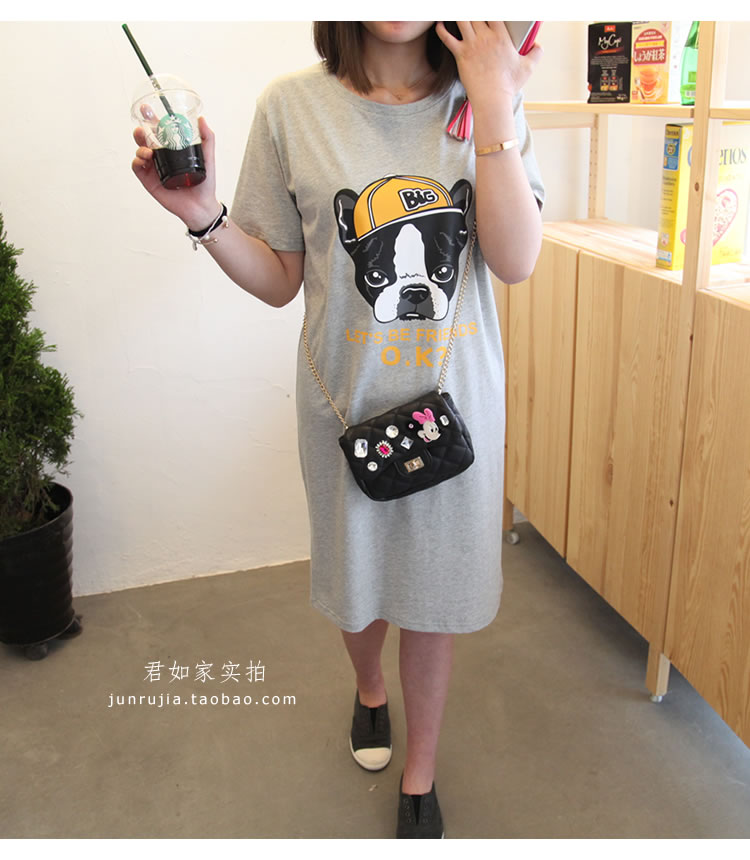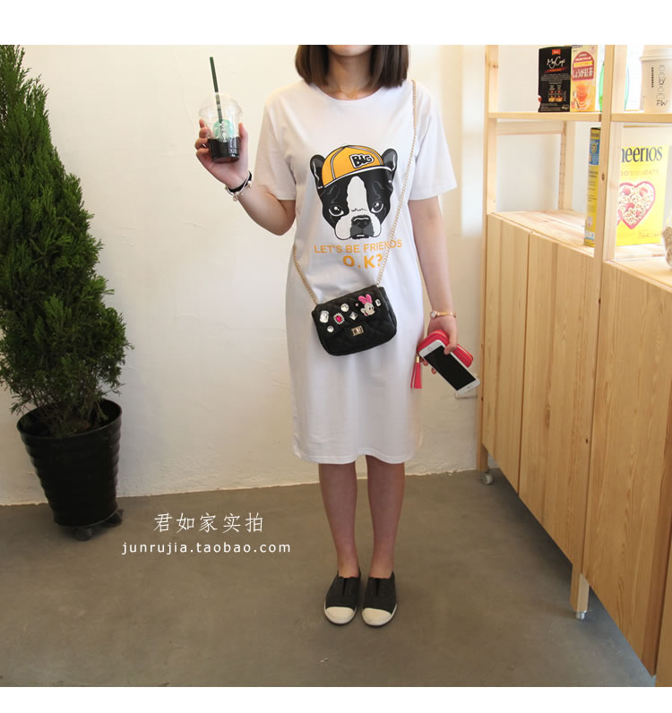 君如家原創自制 100%純棉面料 環保健康,柔和親膚,舒適透氣,不掉色,不起球,不變形 非常顯瘦的長款T裙,長度在95CM左右,完全可以當裙穿哦! 狗狗圖案輕松可愛, 面料成分是100%全棉,厚薄適中,不會很厚,夏天穿不熱 我們獨家定制的面料,黑色面料為活性黑,非硫化黑,非常環保 印花為環保水印,GA型涂料,嬰幼兒級別,無異味,不掉色。 尺碼做的很全,90斤到180斤都可以穿。黑 白 灰 三色隨心搭配 下圖為君如家100%實拍, 模特身高1.68米 體重90斤,為了寬松效果選的M , 實際選S合身點
