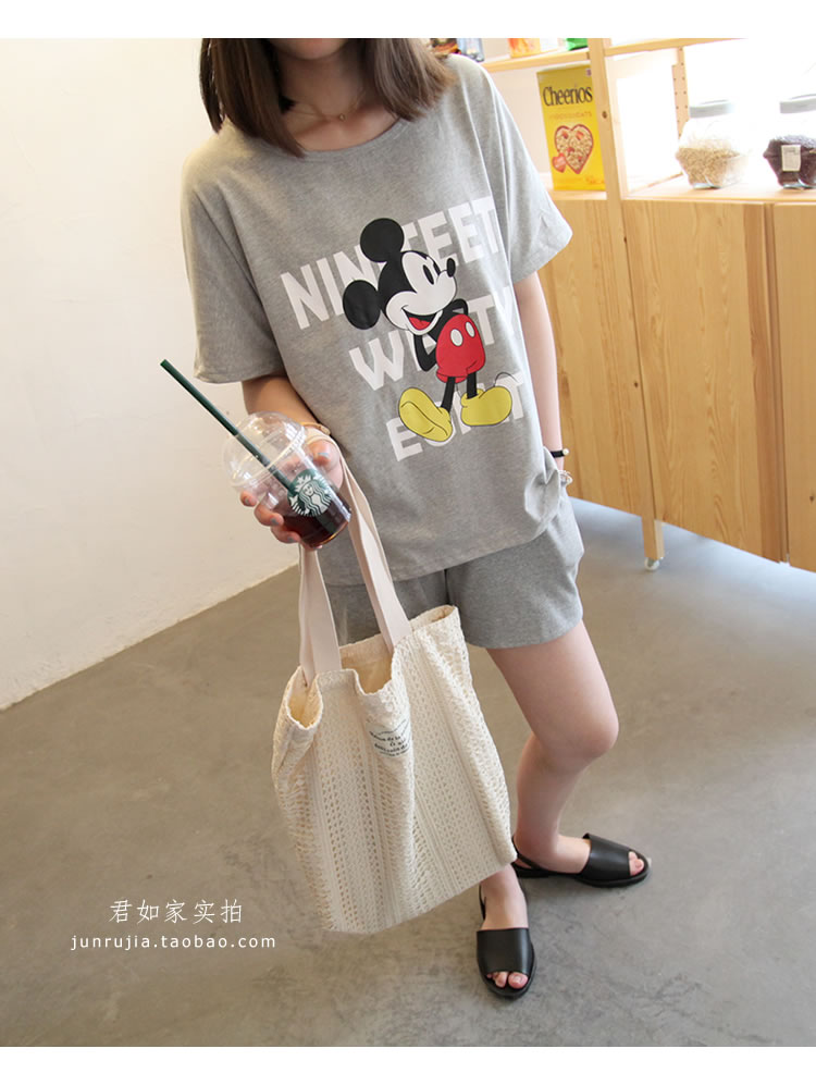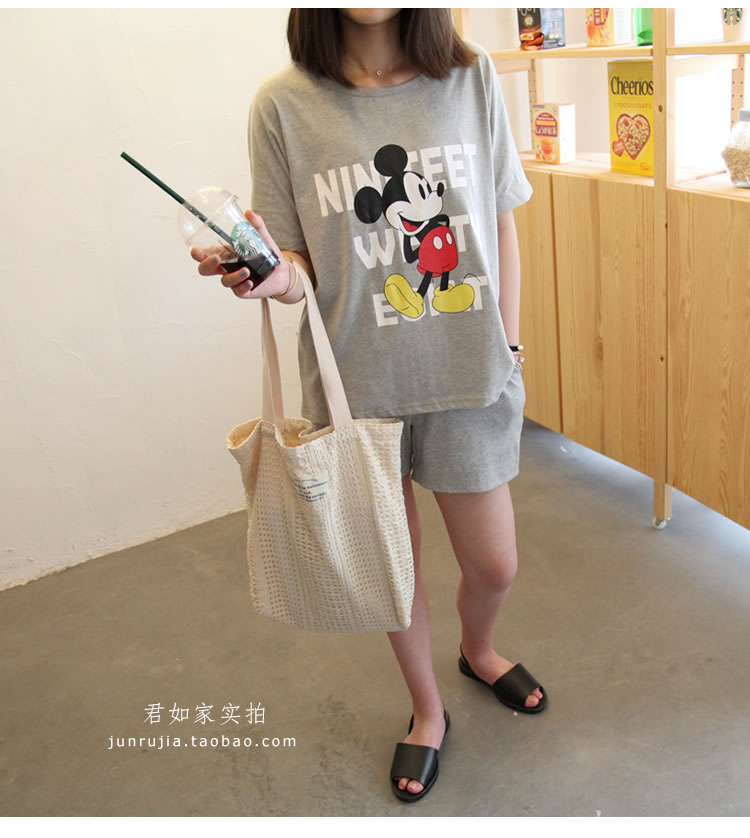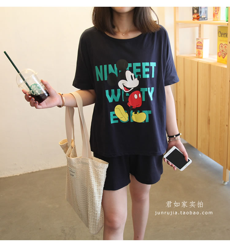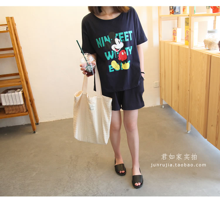 君如家原創自制!100%全棉面料! 非常贊的夏季休閑套裝,家居外穿 運動健身 或 出游外穿 都可以。 卡通米奇圖案配色明快, 輕松可愛,寬松韓范兒,深藍色很顯瘦。 面料不會厚,就夏季常規T厚度,穿起來挺涼快的。 兩件套這個價格包含衣服+短褲, 做了孕婦和非孕婦兩個版本,上衣是一樣的,就短褲有區別。 孕婦版本短褲有托腹設計, 非孕婦版本短褲無托腹設計。 做了M L XL三個尺碼,覆蓋體重90斤到200斤。 經測試,體重200斤同事+肚子墊孕婦道具,穿XL毫無束縛感 體重90斤同事,穿M, 褲子不會掉, 根據試穿效果,個人推薦藏藍色哦,藏藍色顯瘦又好看。 這個套裝孕婦穿也好看的,你們收到實物試穿就知道哦, 這款我很滿意,相信不會讓你們失望的。 下圖為君如家模特100%實拍, 模特身高1.70米 體重90斤 穿的M號寬松效果
