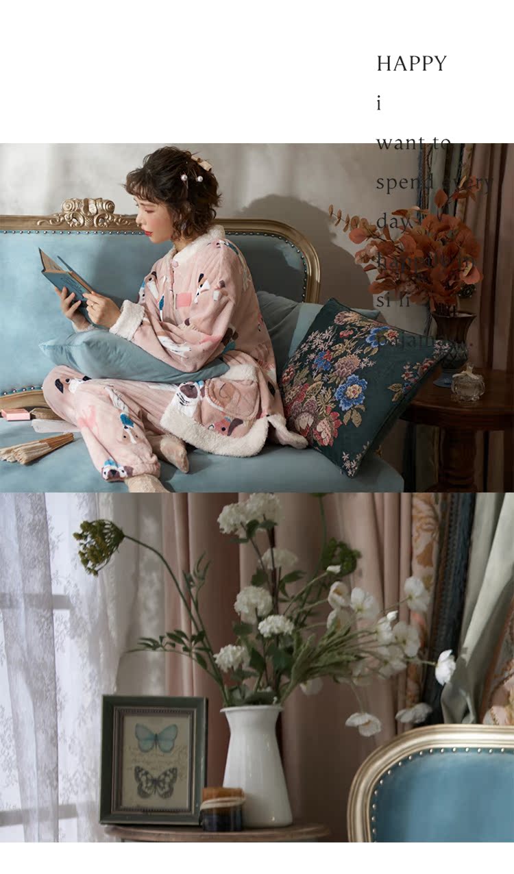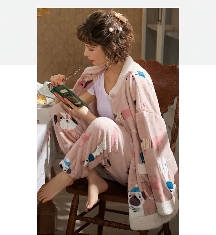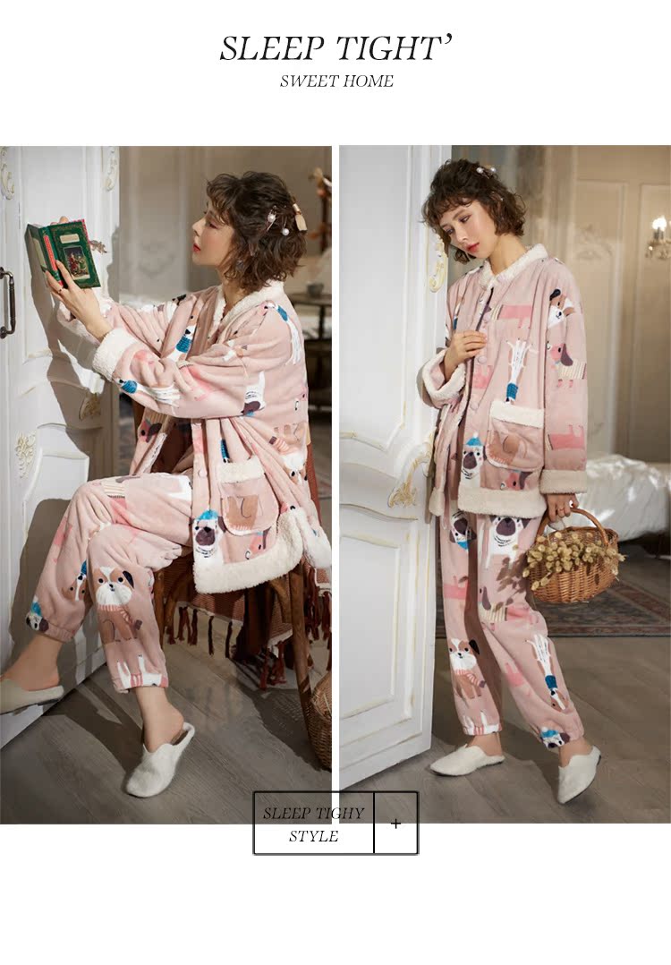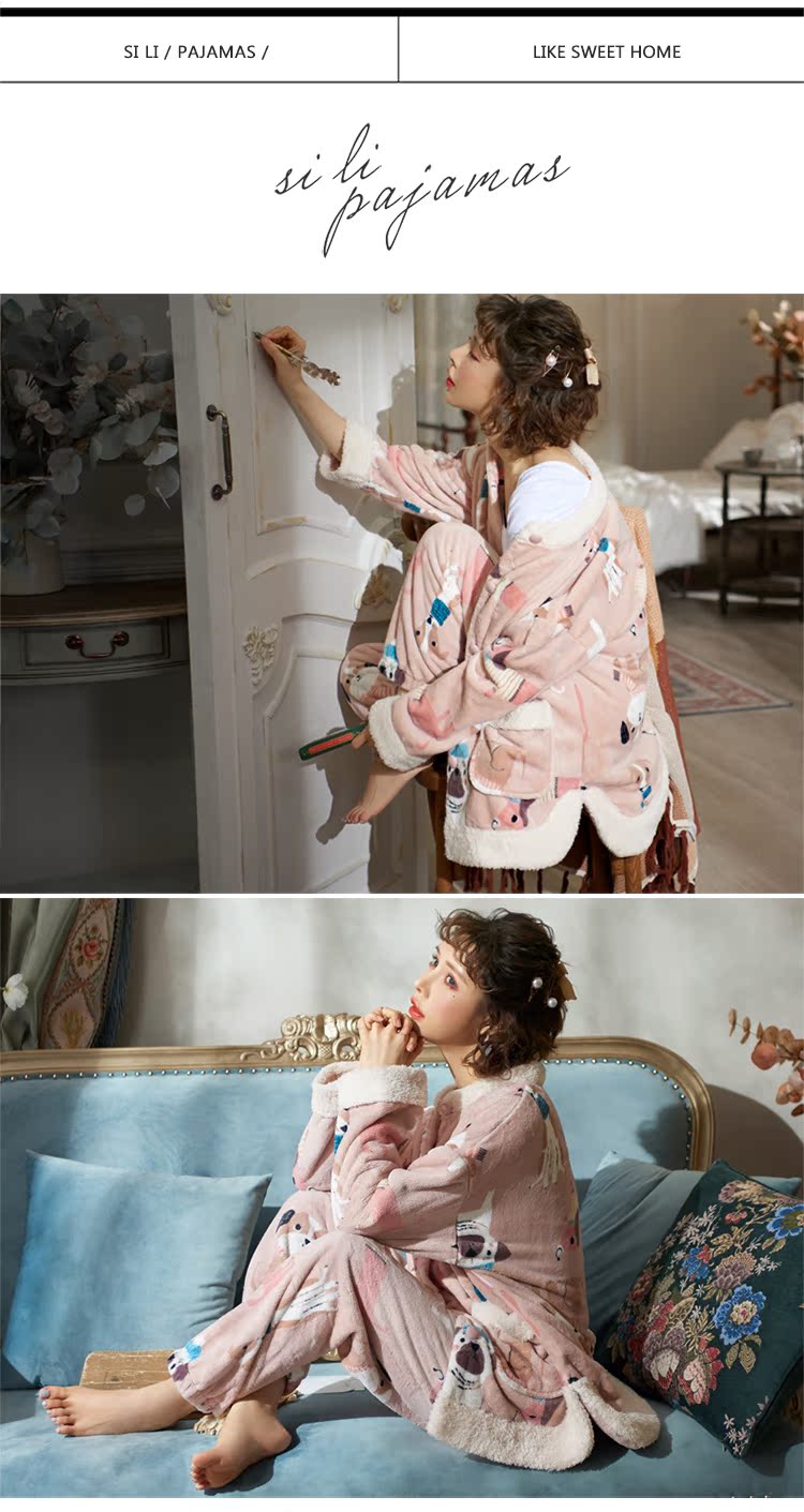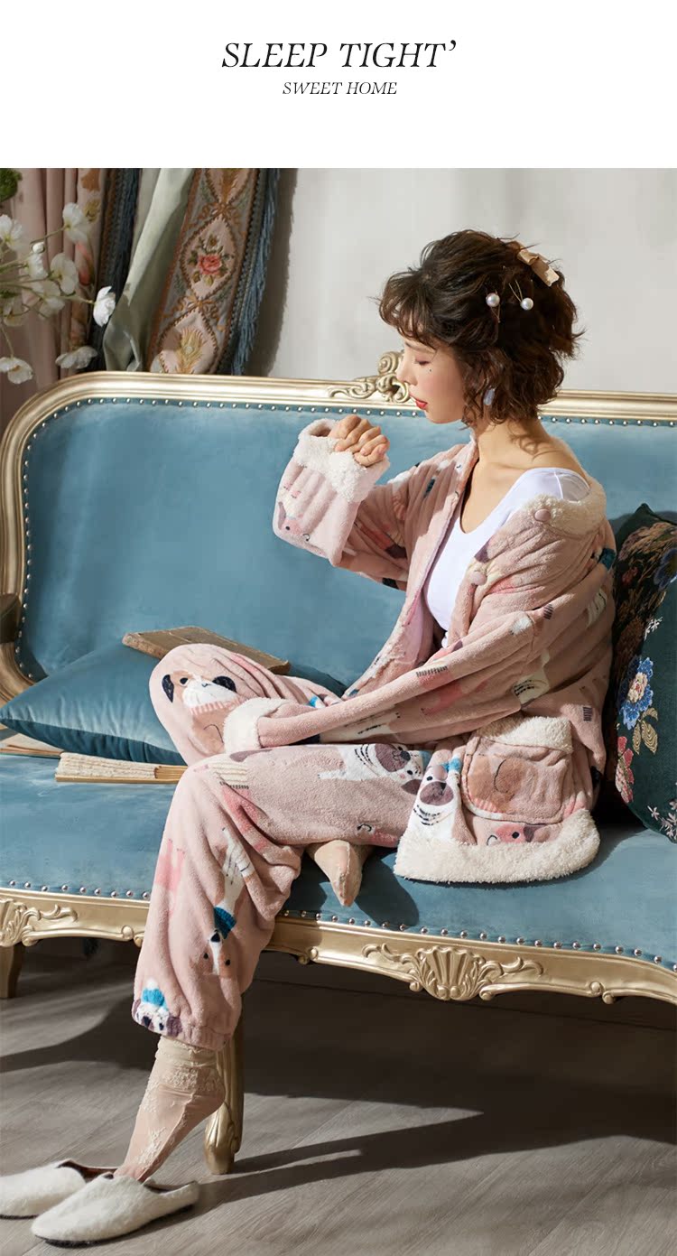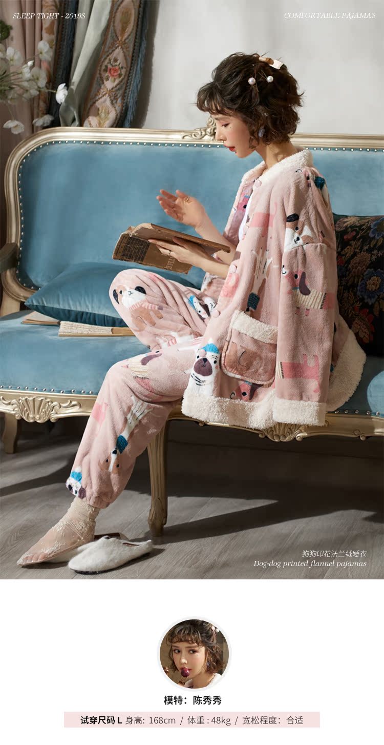 2019新款秋冬季珊瑚絨睡衣女毛茸茸可愛動物網紅款甜美法蘭絨套裝1入