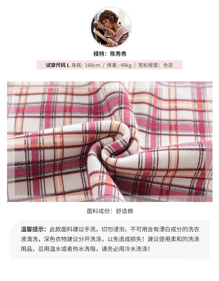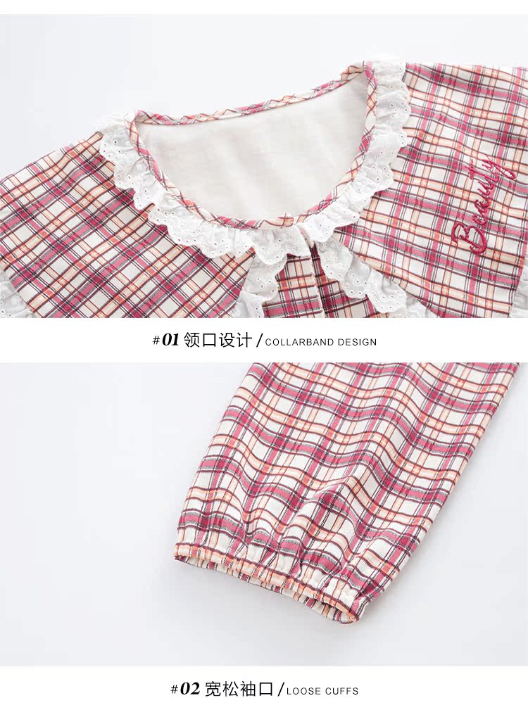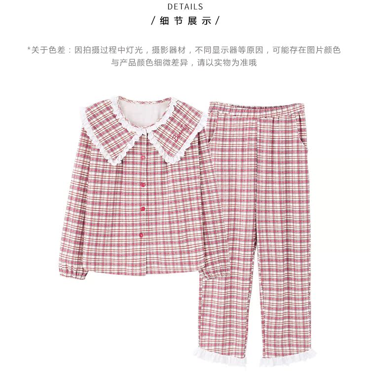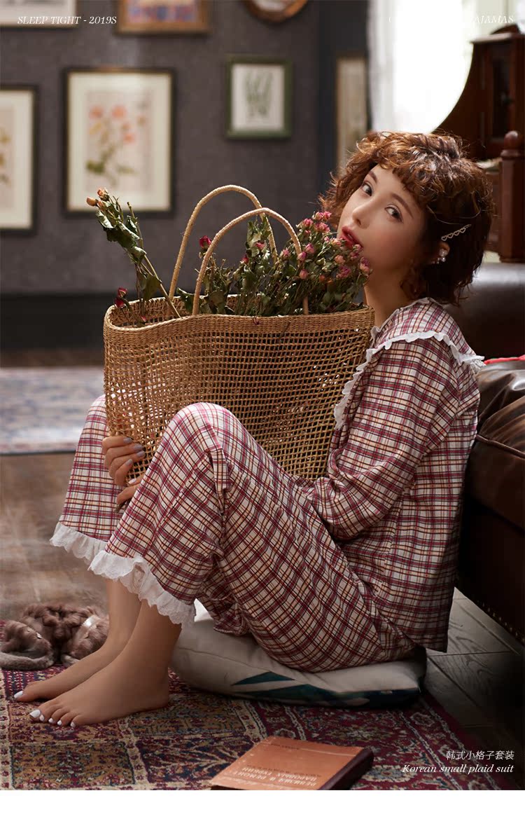 韓國格子睡衣女春秋純棉長袖公主風甜美可愛韓式開衫家居服套裝1入