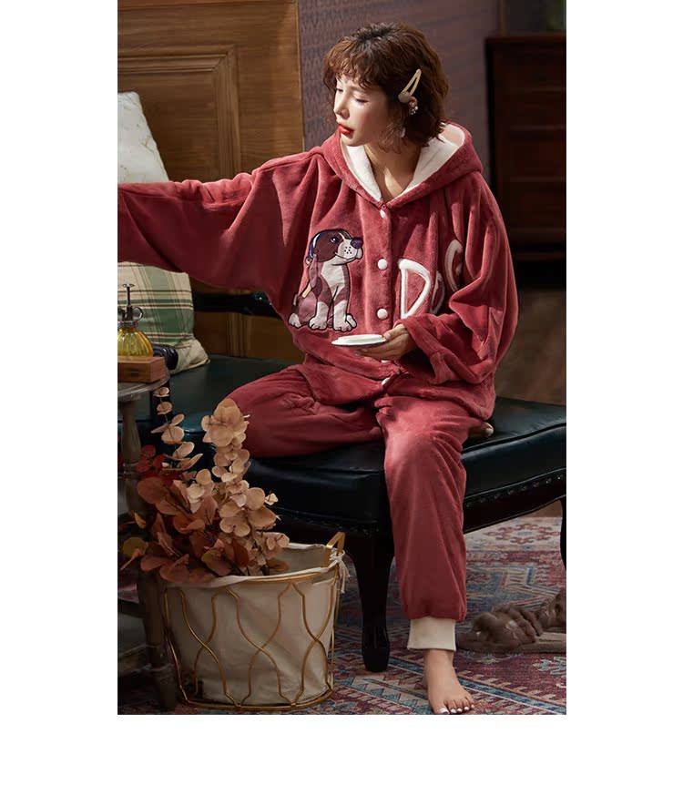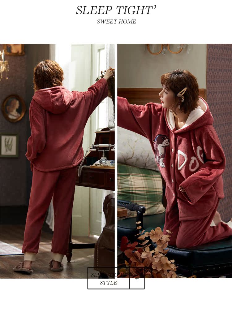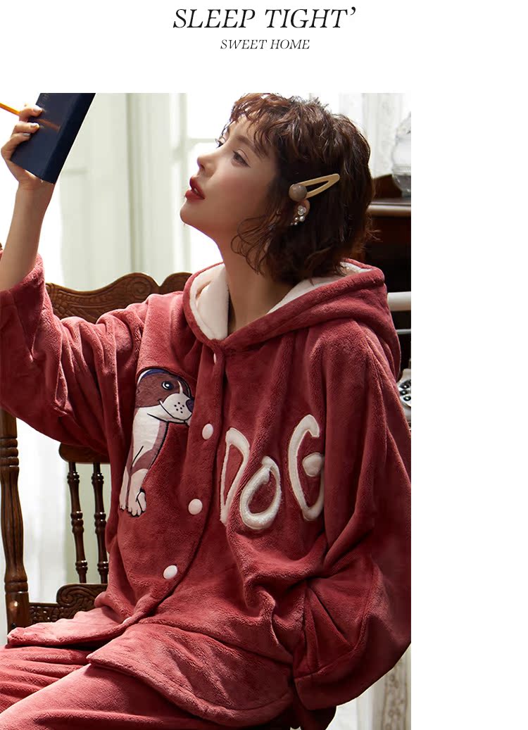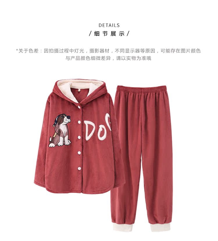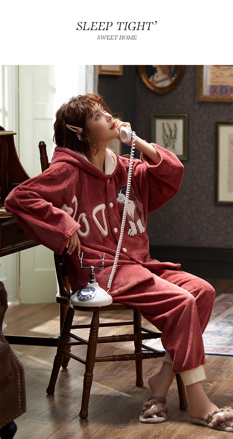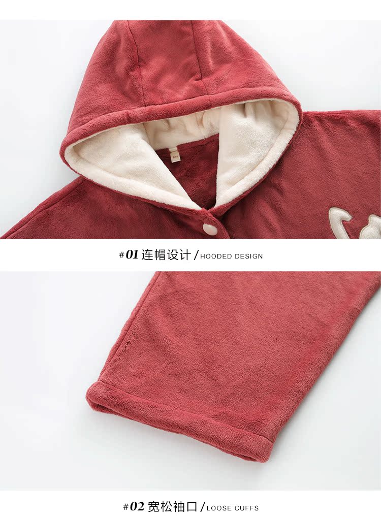 2019新款珊瑚絨睡衣女秋冬季加厚加絨可愛冬天連帽可外穿保暖套裝1入