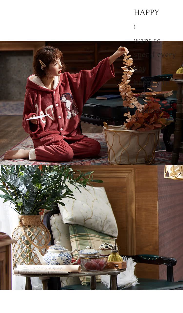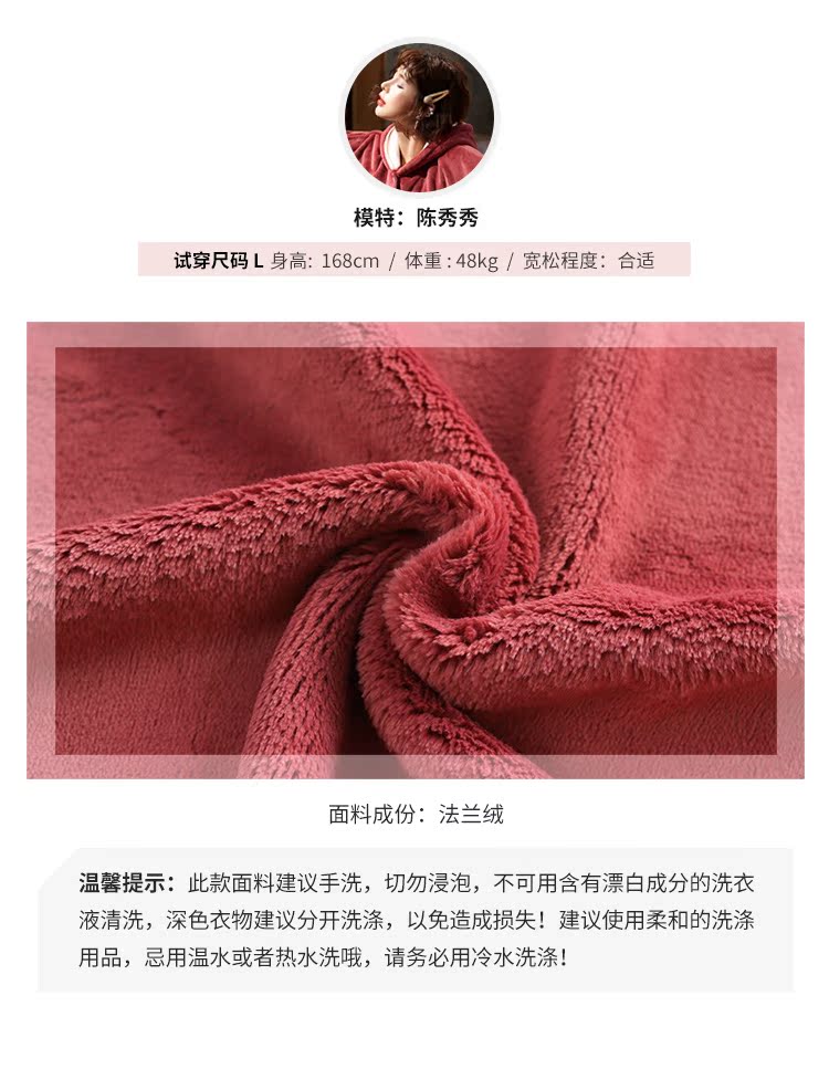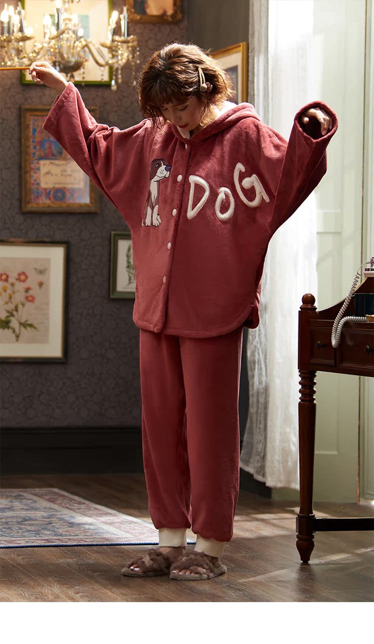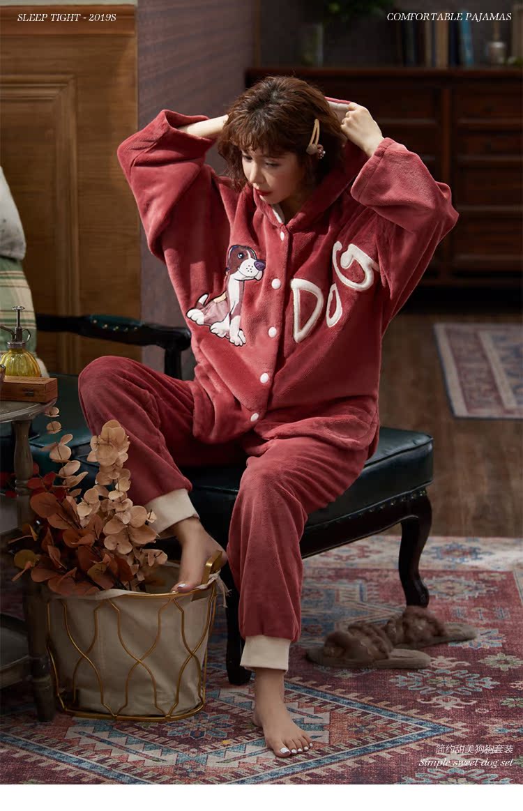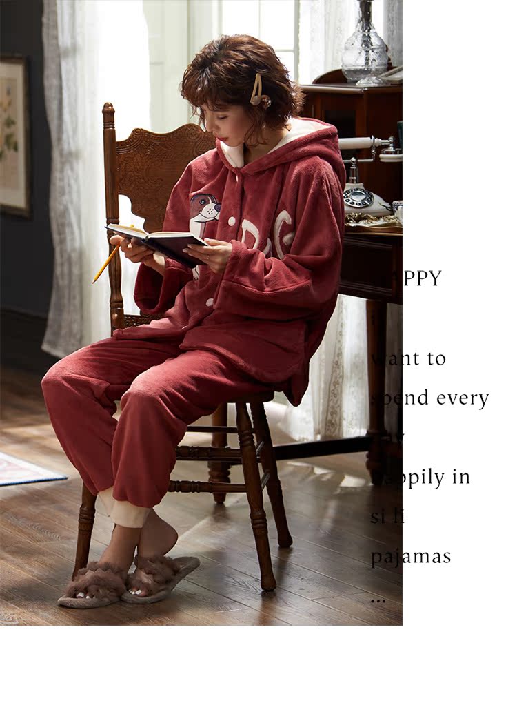 2019新款珊瑚絨睡衣女秋冬季加厚加絨可愛冬天連帽可外穿保暖套裝1入