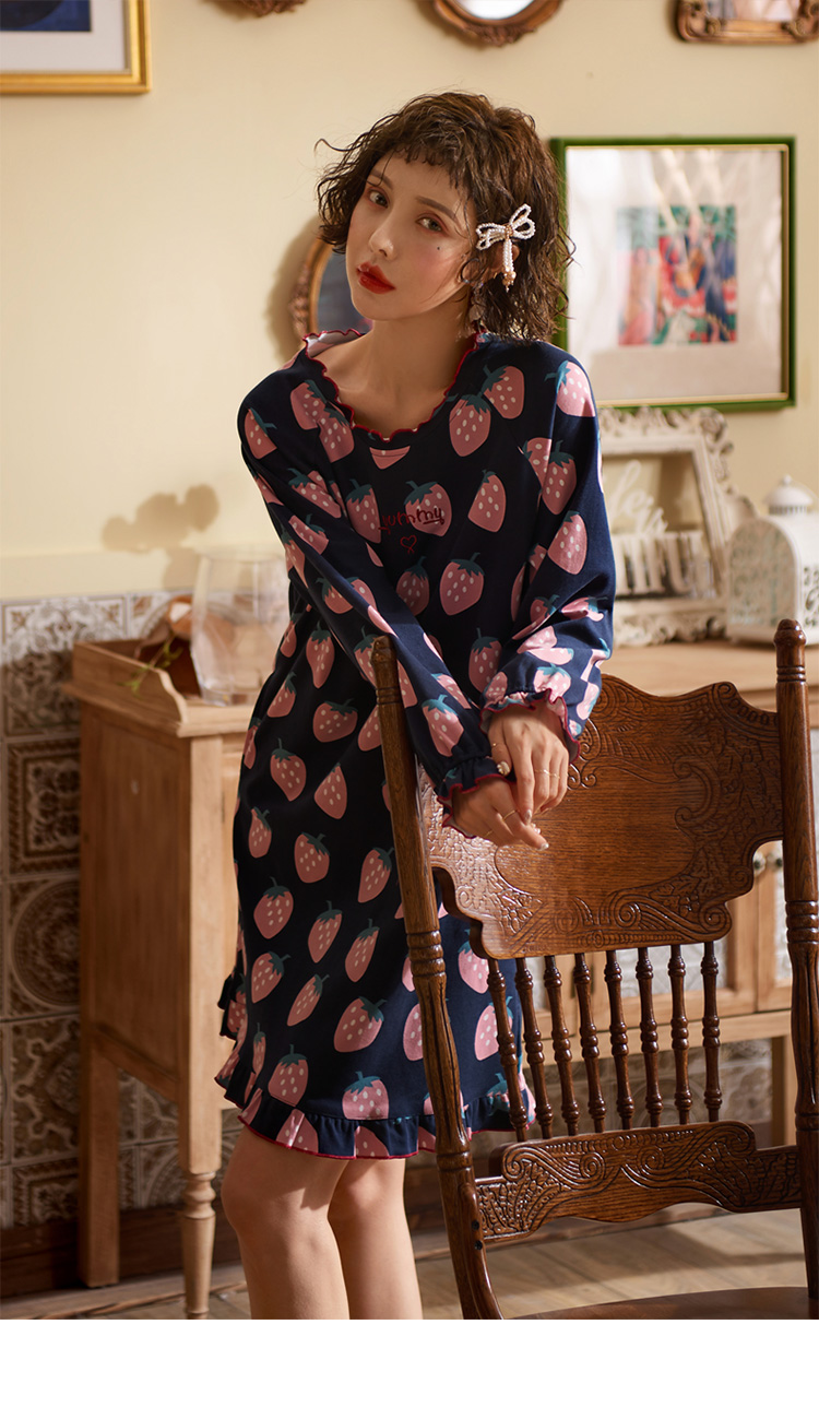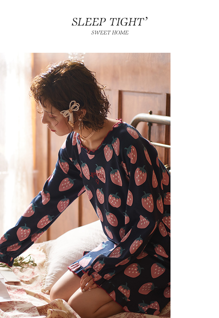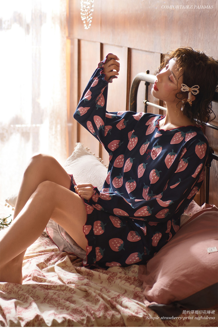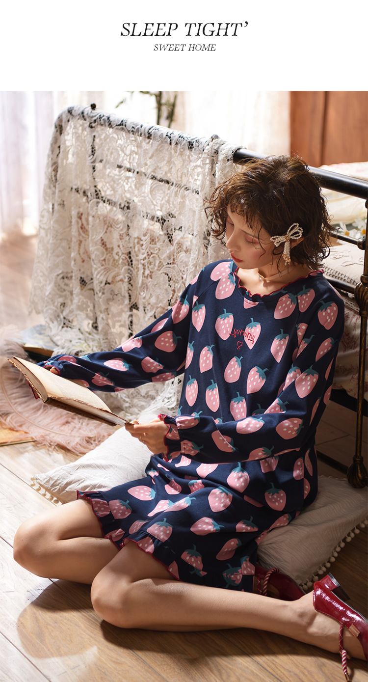 長袖睡裙女春秋薄款純棉學生宿舍可愛日系軟妹草莓秋季睡衣可外穿1入