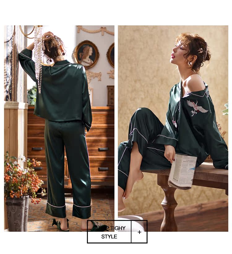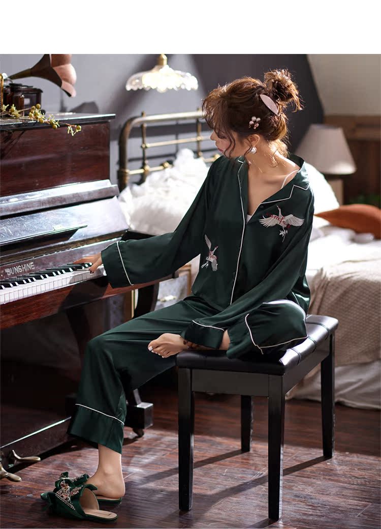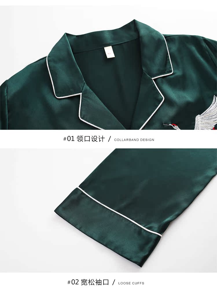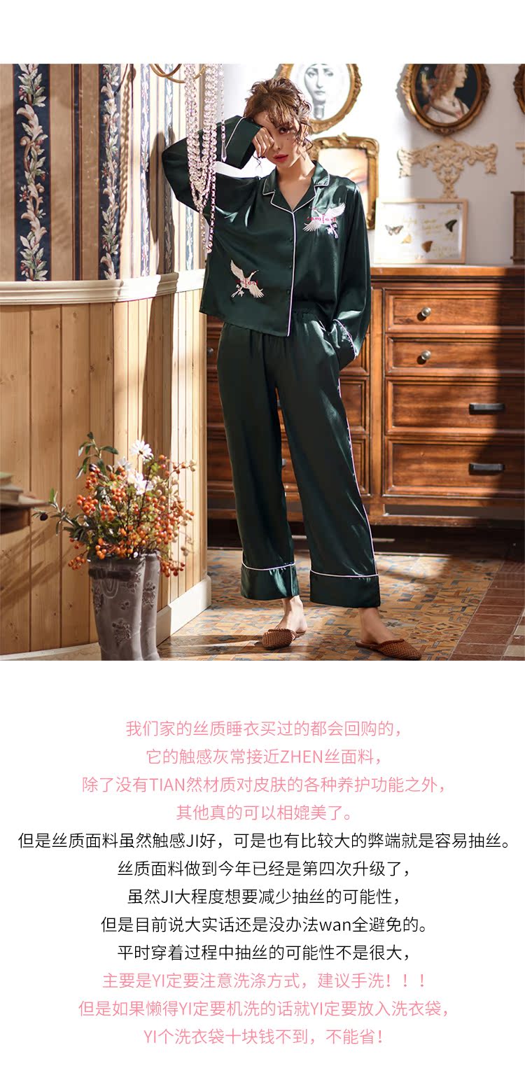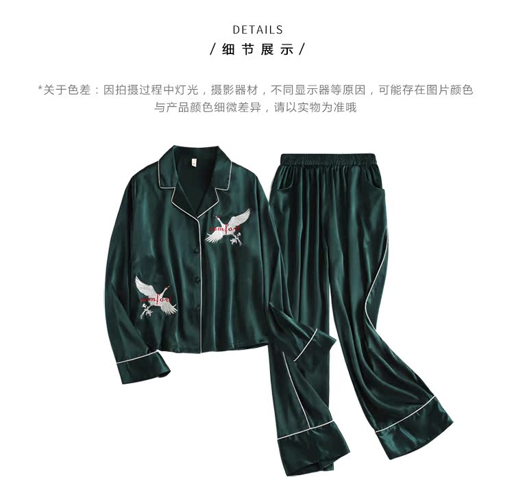 2019新款睡衣女春秋冰絲夏季薄款墨綠色仙鶴刺繡仿真絲長袖兩件套1入