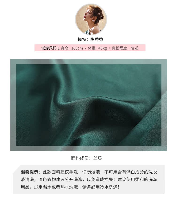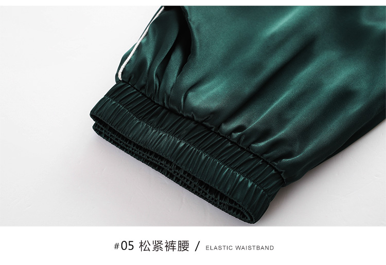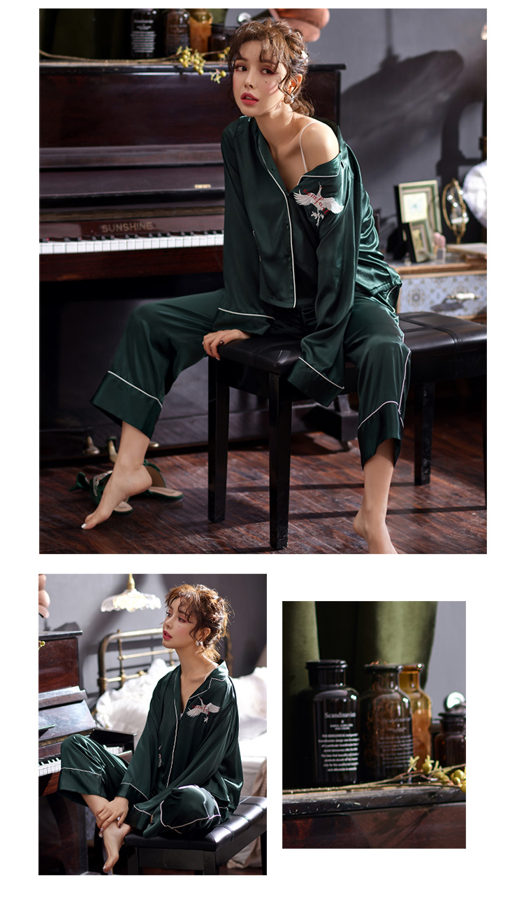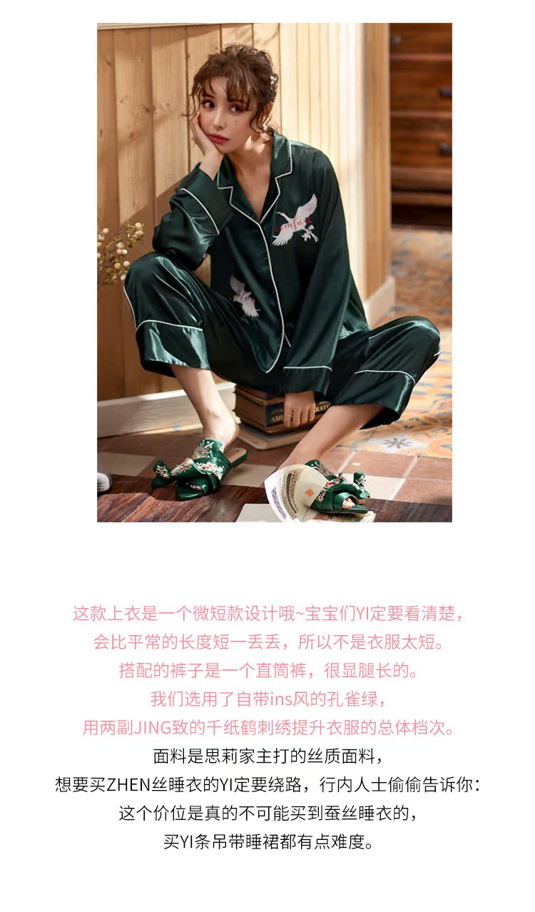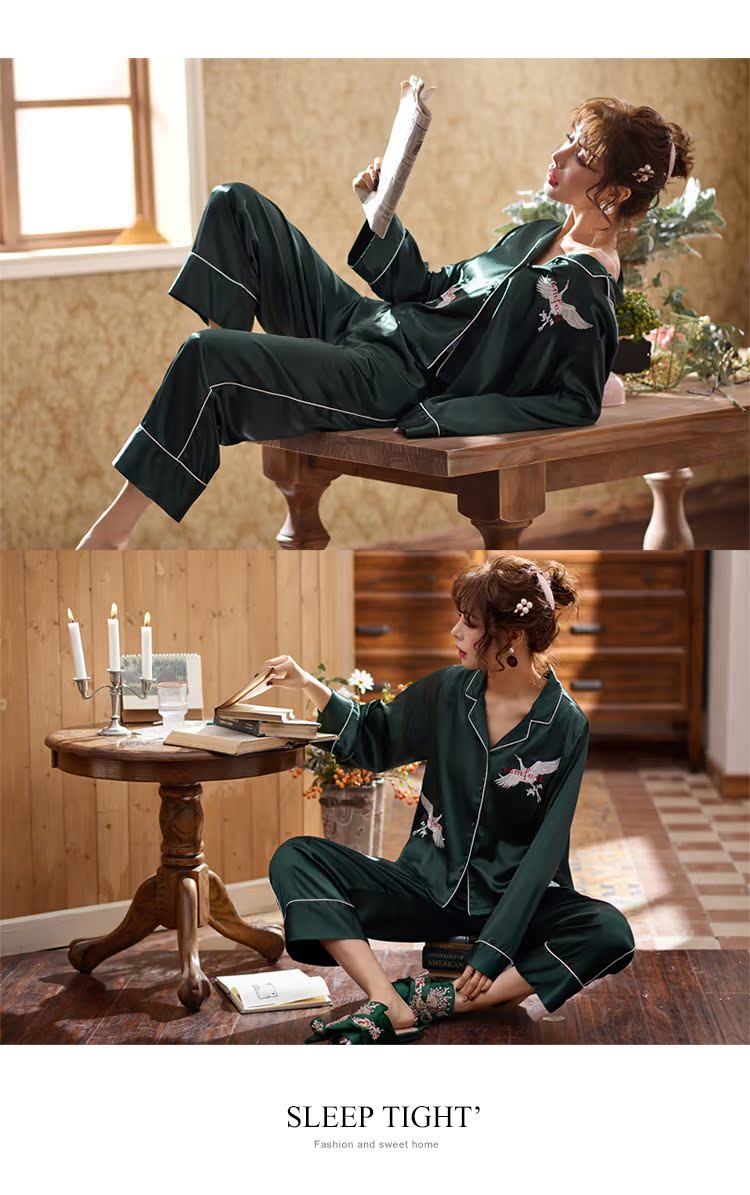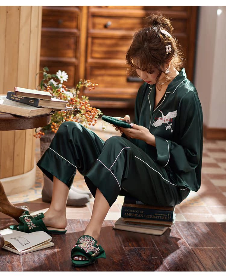 2019新款睡衣女春秋冰絲夏季薄款墨綠色仙鶴刺繡仿真絲長袖兩件套1入