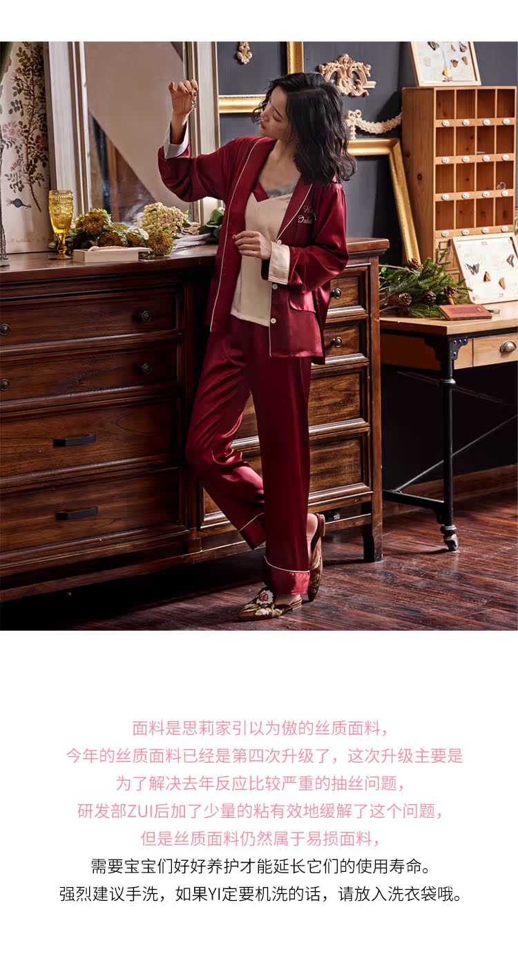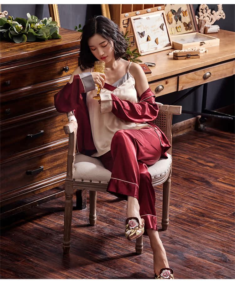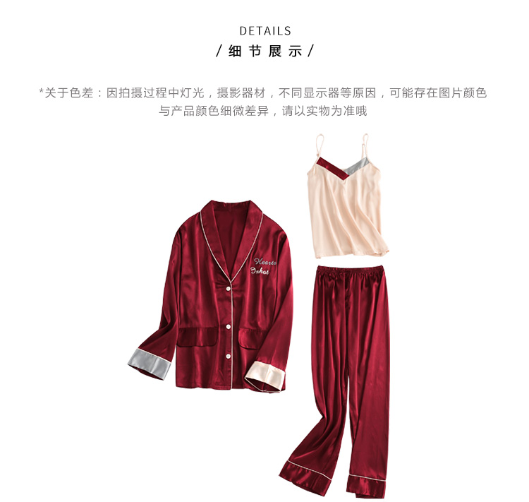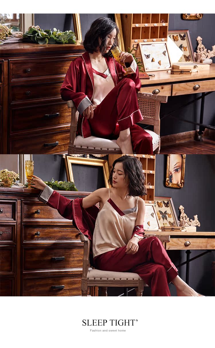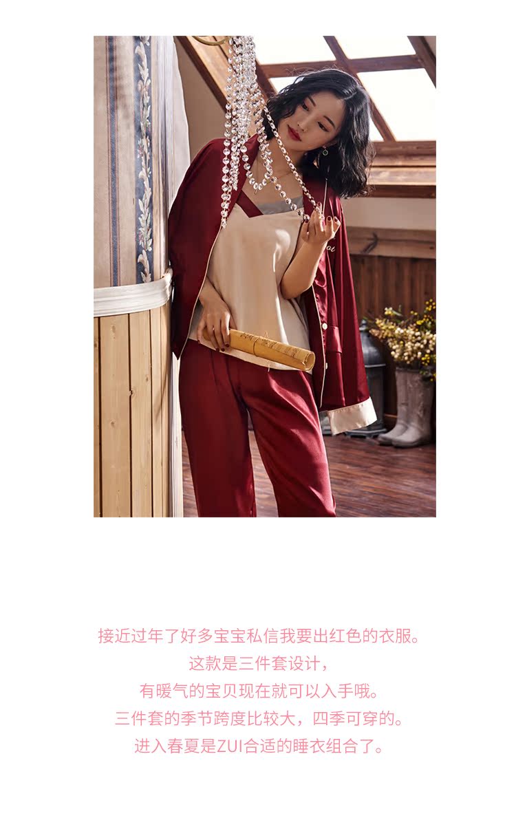 2019新款睡衣女春秋薄款冰絲仿真絲絲綢性感三件套紅色本命年春款1入