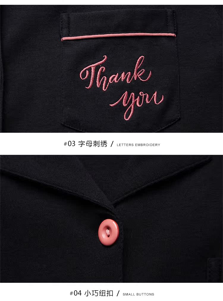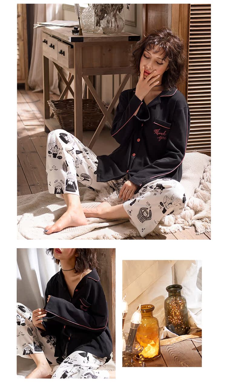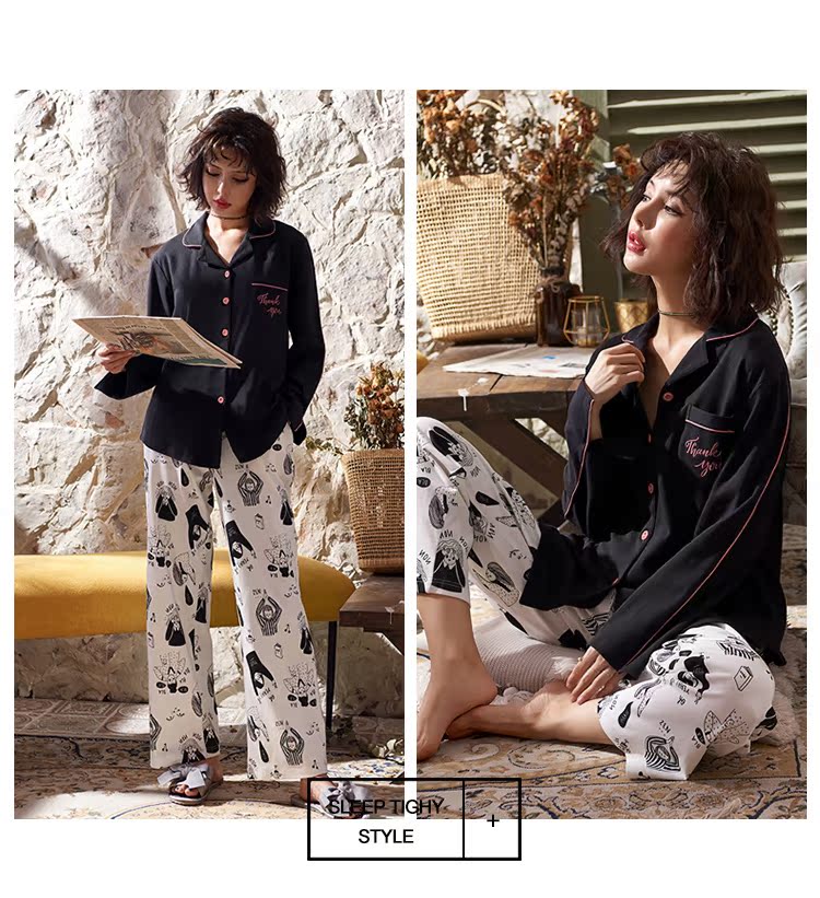 2018新款秋季睡衣女長袖純棉韓版寬松黑色小性感潮款秋裝兩件套裝1入