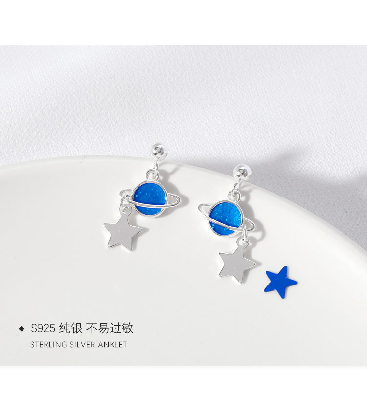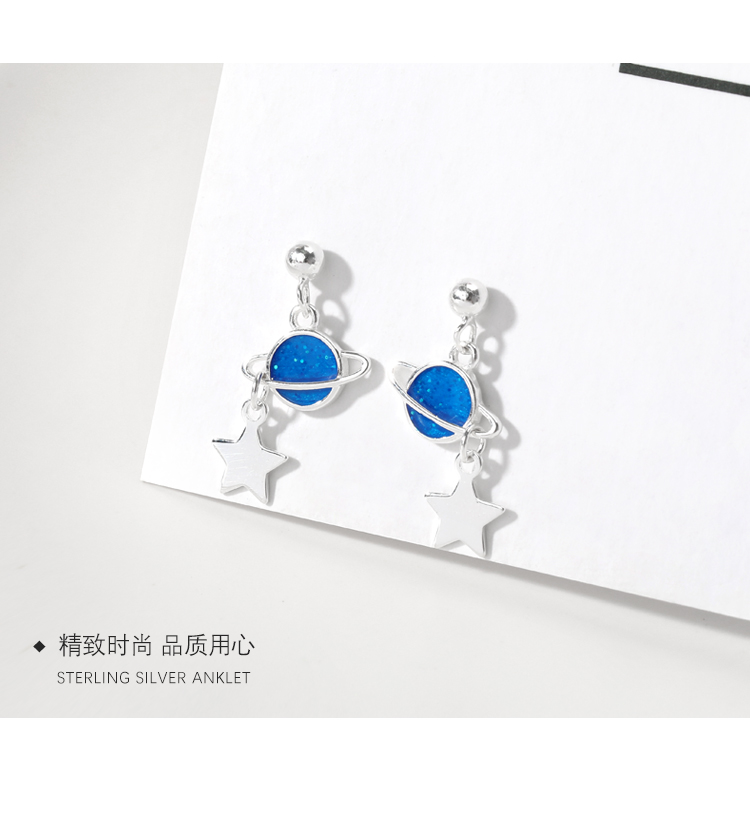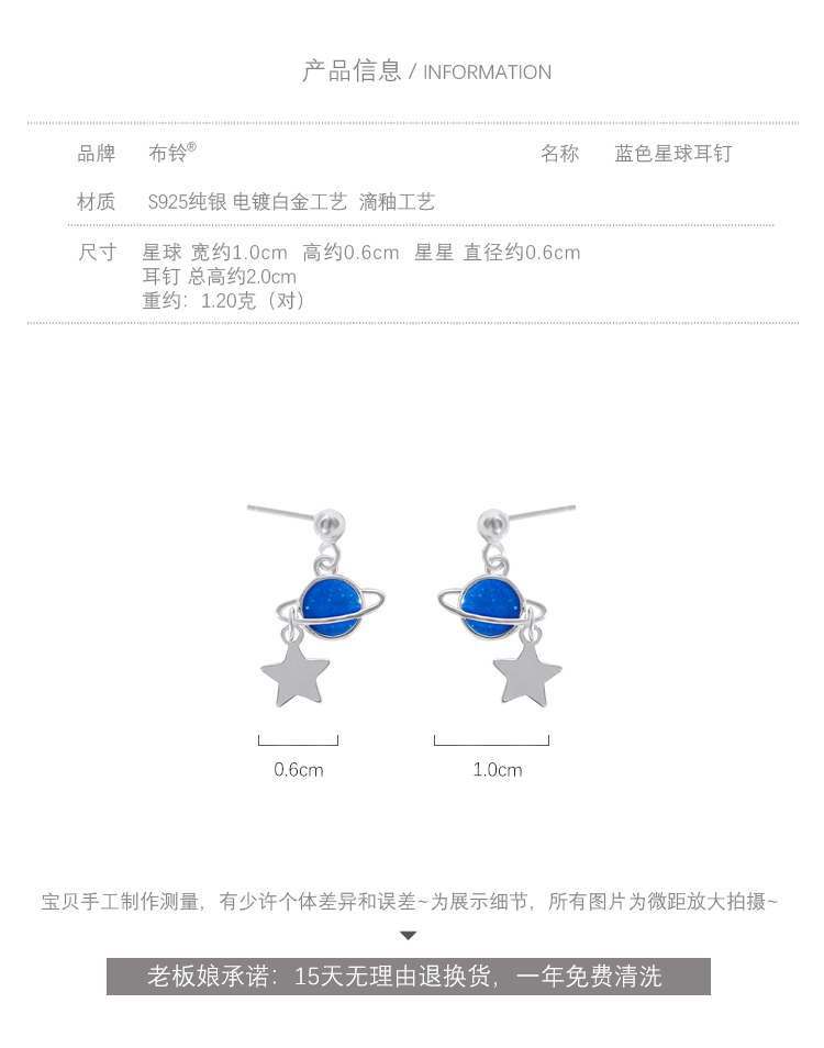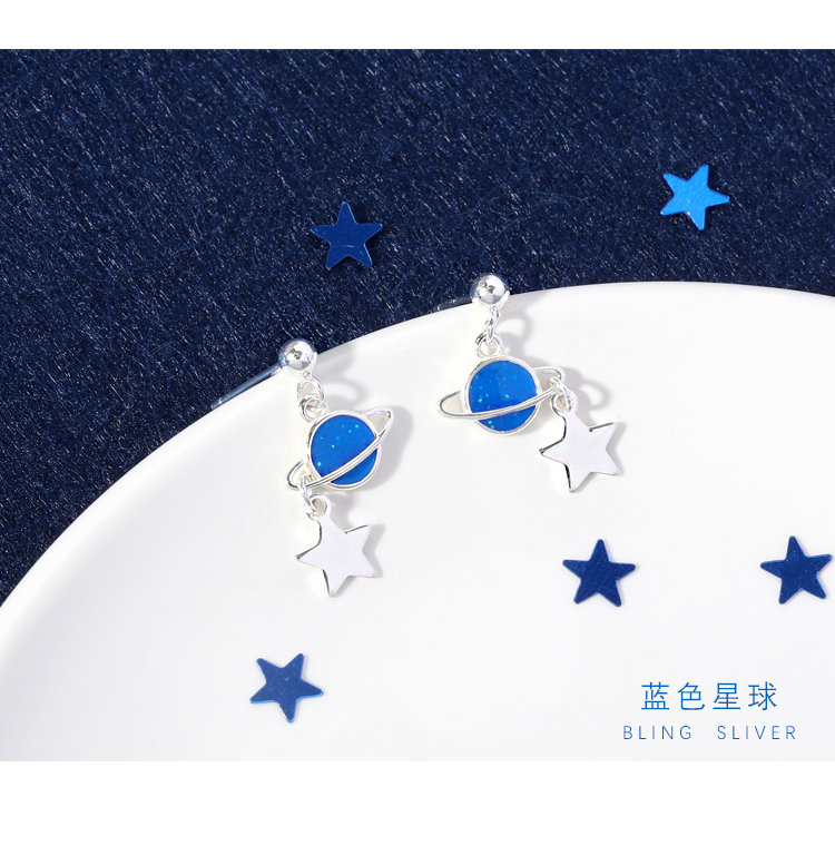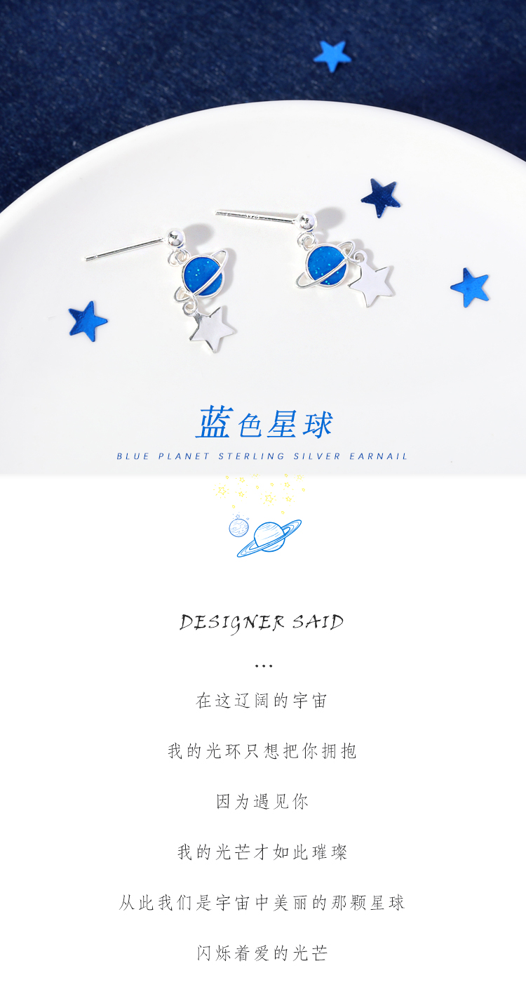 設計感藍色宇宙星球耳釘女純銀小簡約冷淡風小眾網紅少女可愛耳飾1入