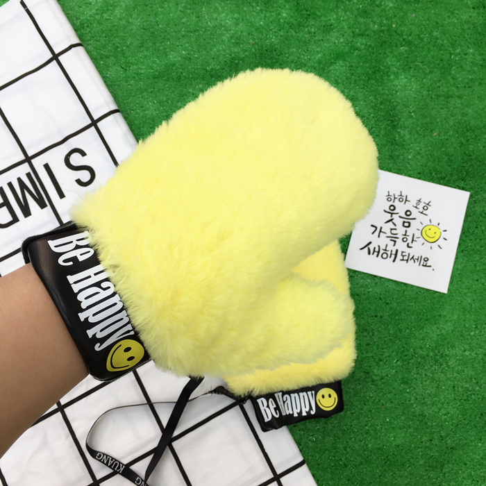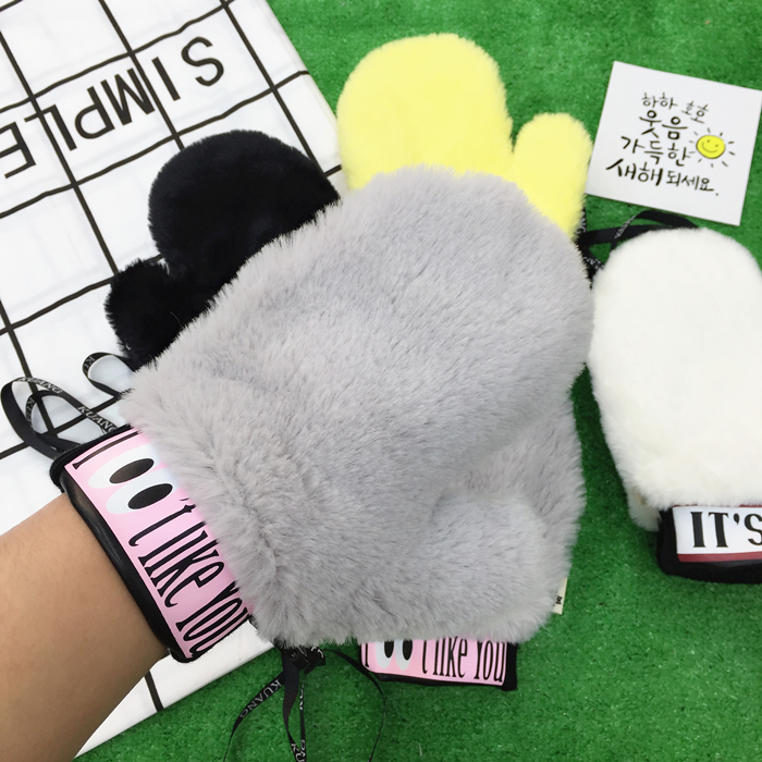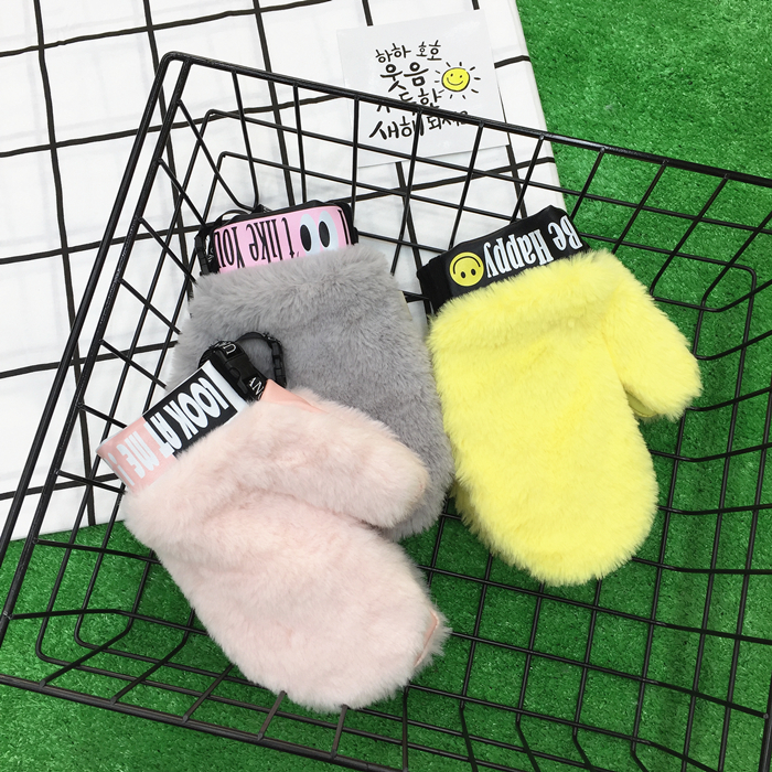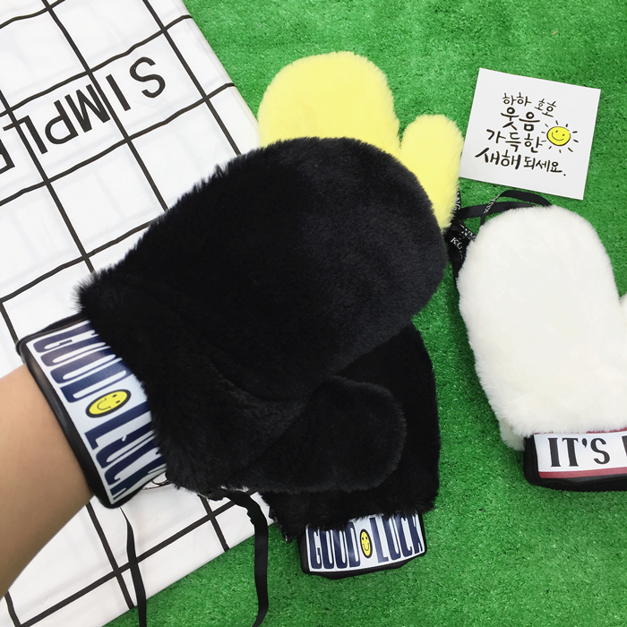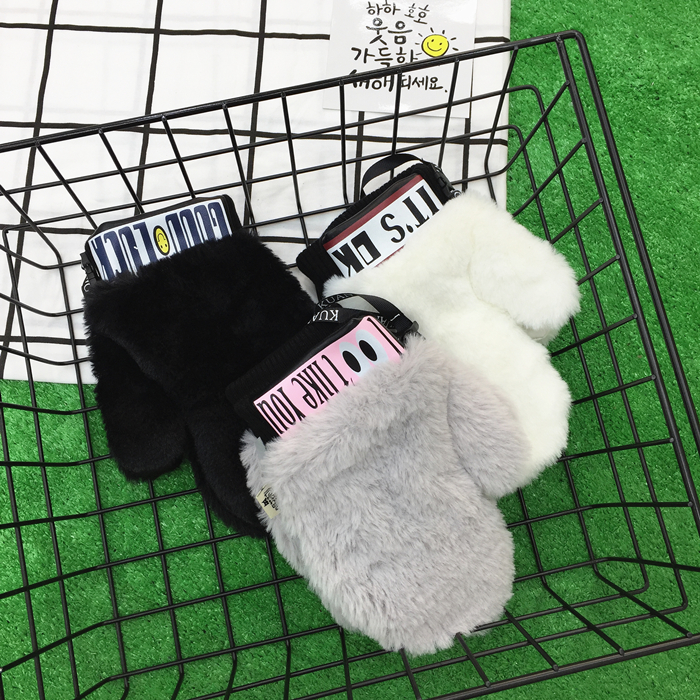 韓國冬季拼接防寒毛絨加絨全指加厚保暖學生男女情侶字母掛脖手套1入