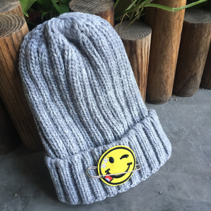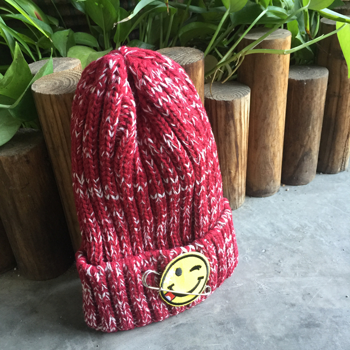 韓國原宿卡通可愛笑臉別針毛線帽子韓版保暖帽日系男女情侶針織帽1入
