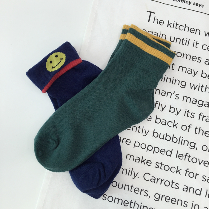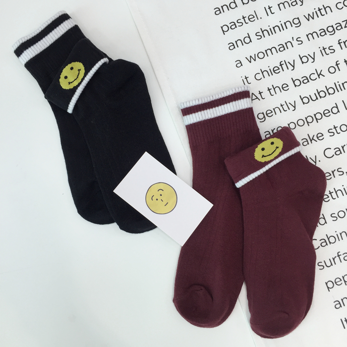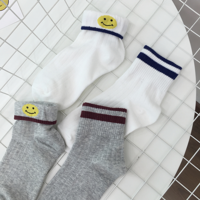 韓國原宿秋冬新款可愛卡通笑臉襪子翻邊棉襪雙杠條紋學院風女襪1入