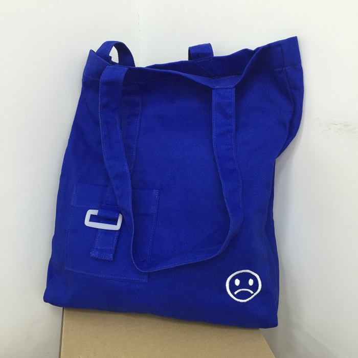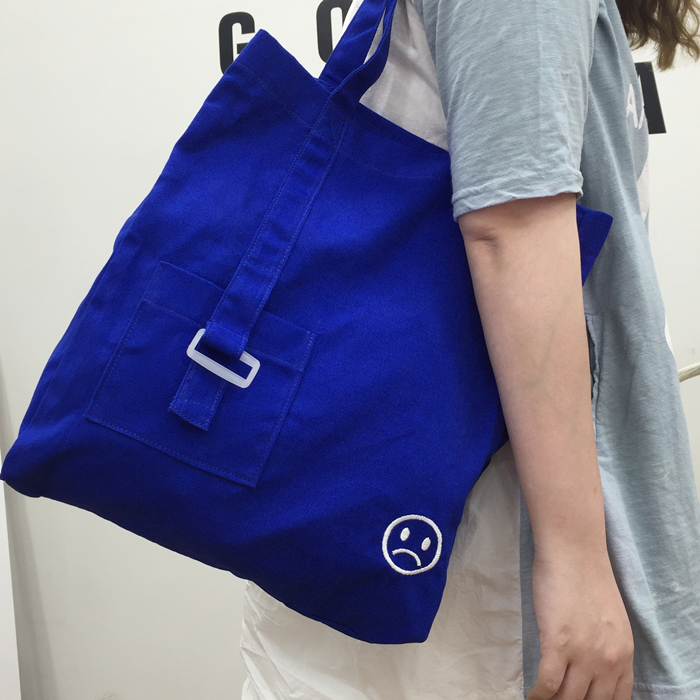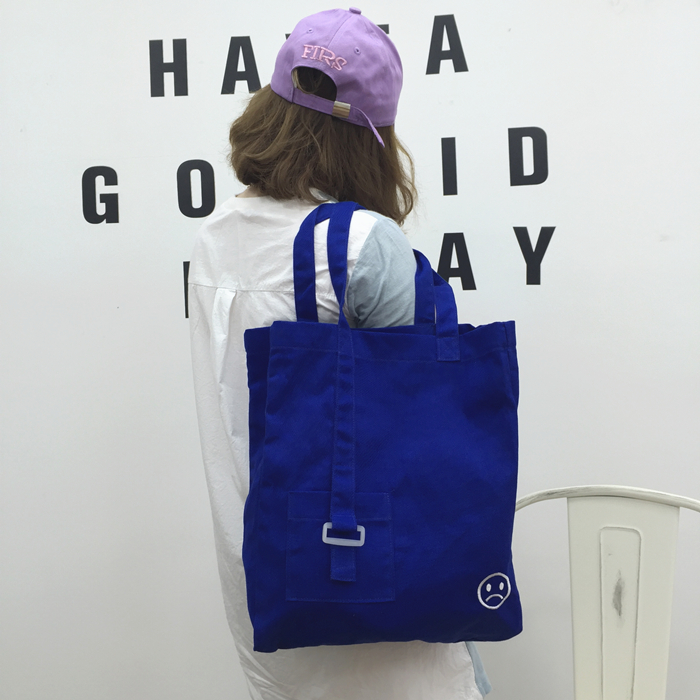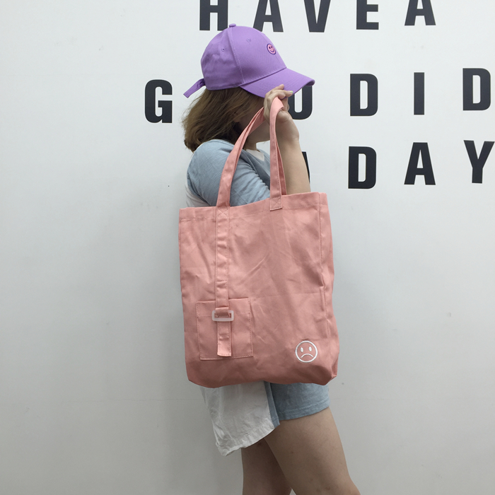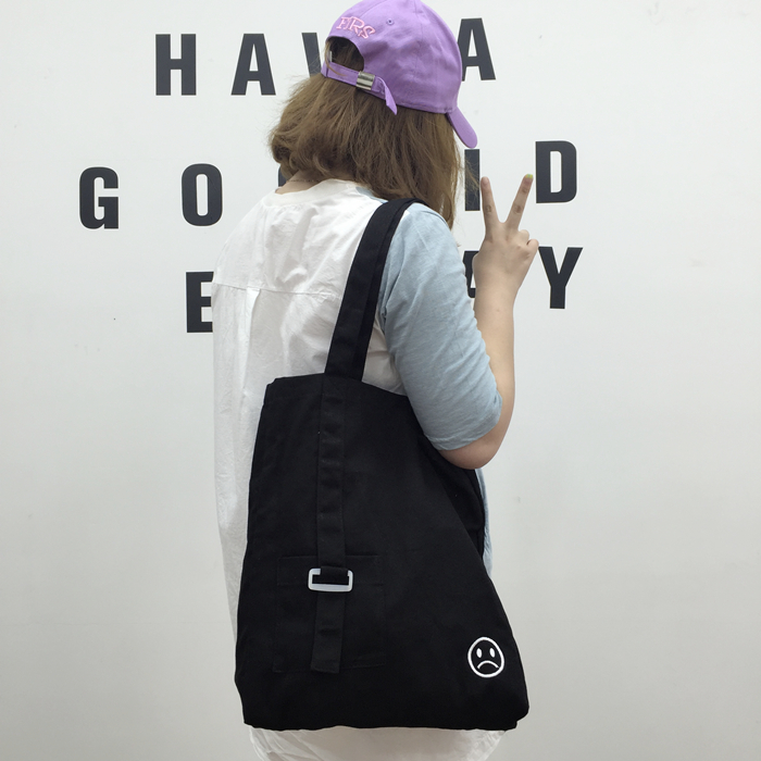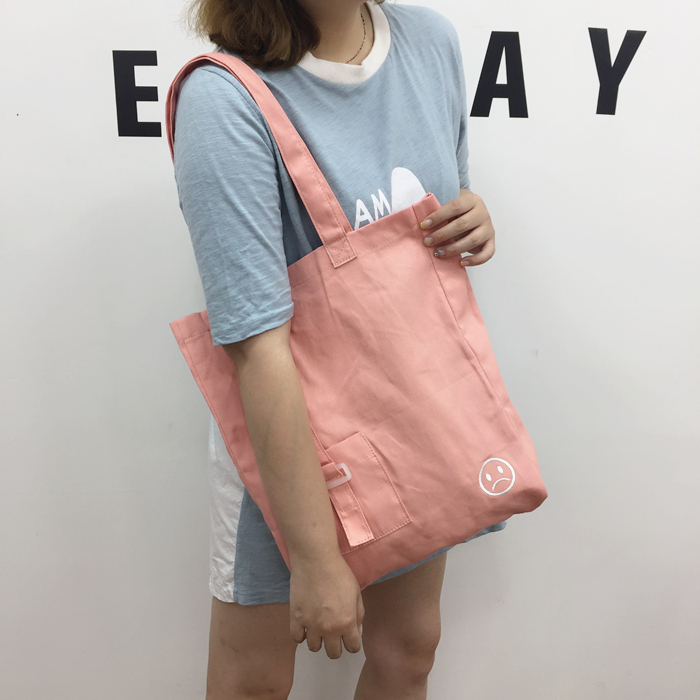 韓國簡約刺繡哭臉百搭帆布單肩包文藝森系購物袋學生純色背包大包1入