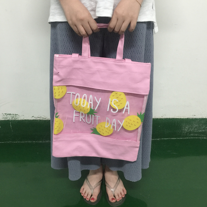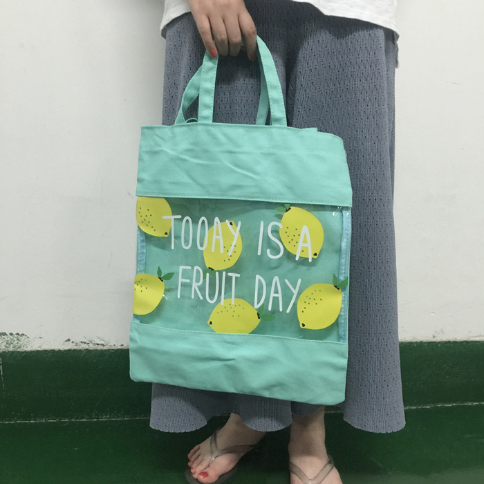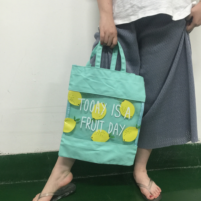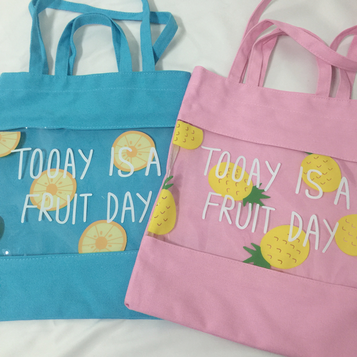 韓國小清新水果帆布拼接單肩包百搭學生沙灘包透明英文果凍購物袋1入