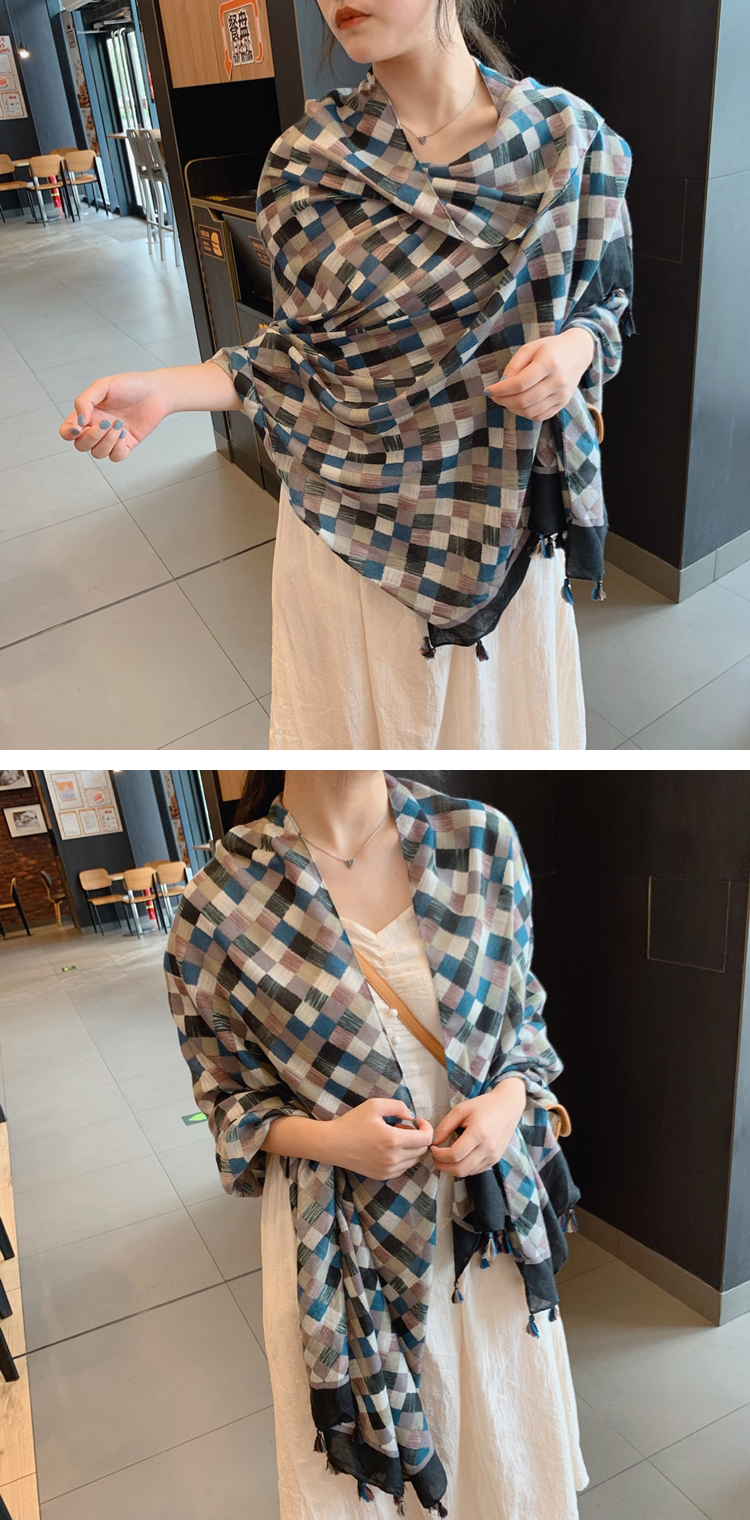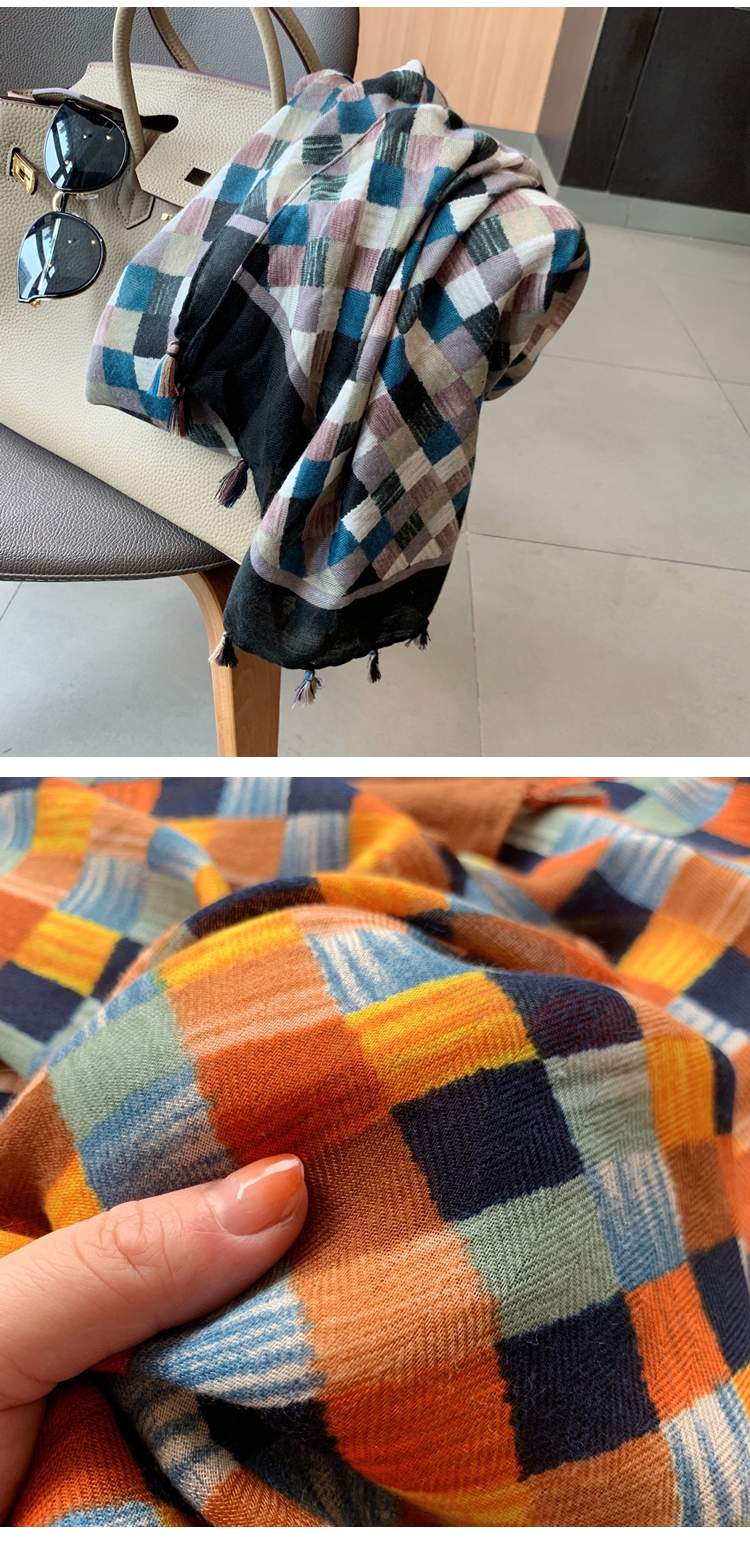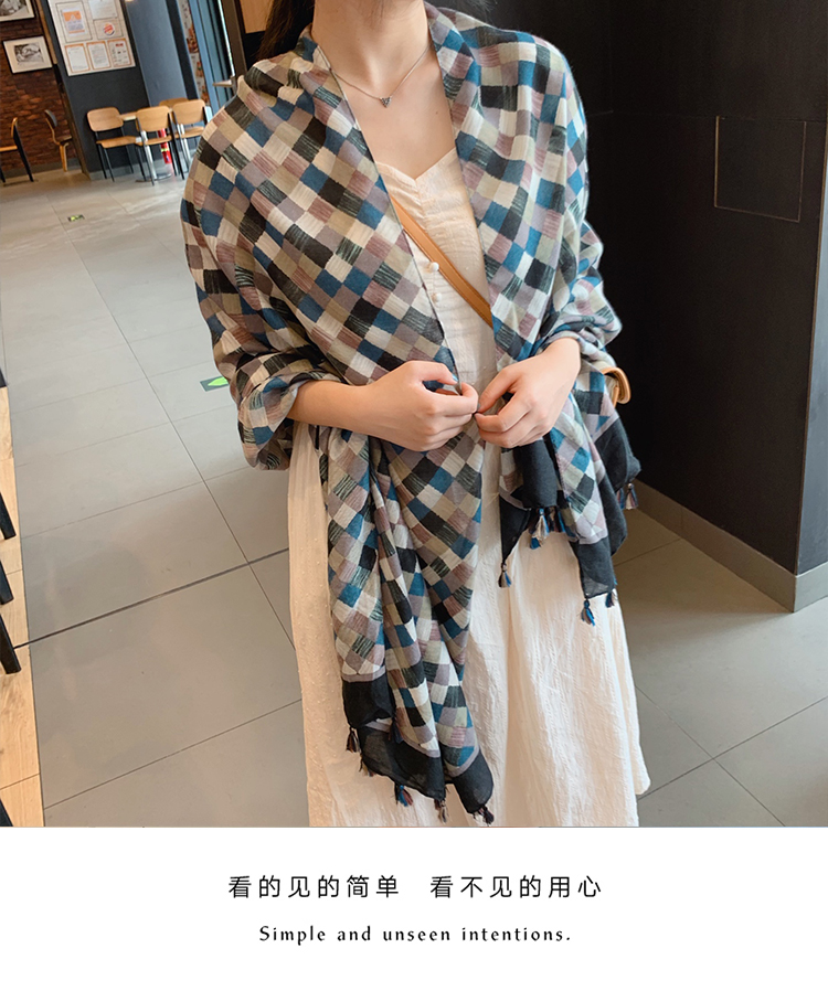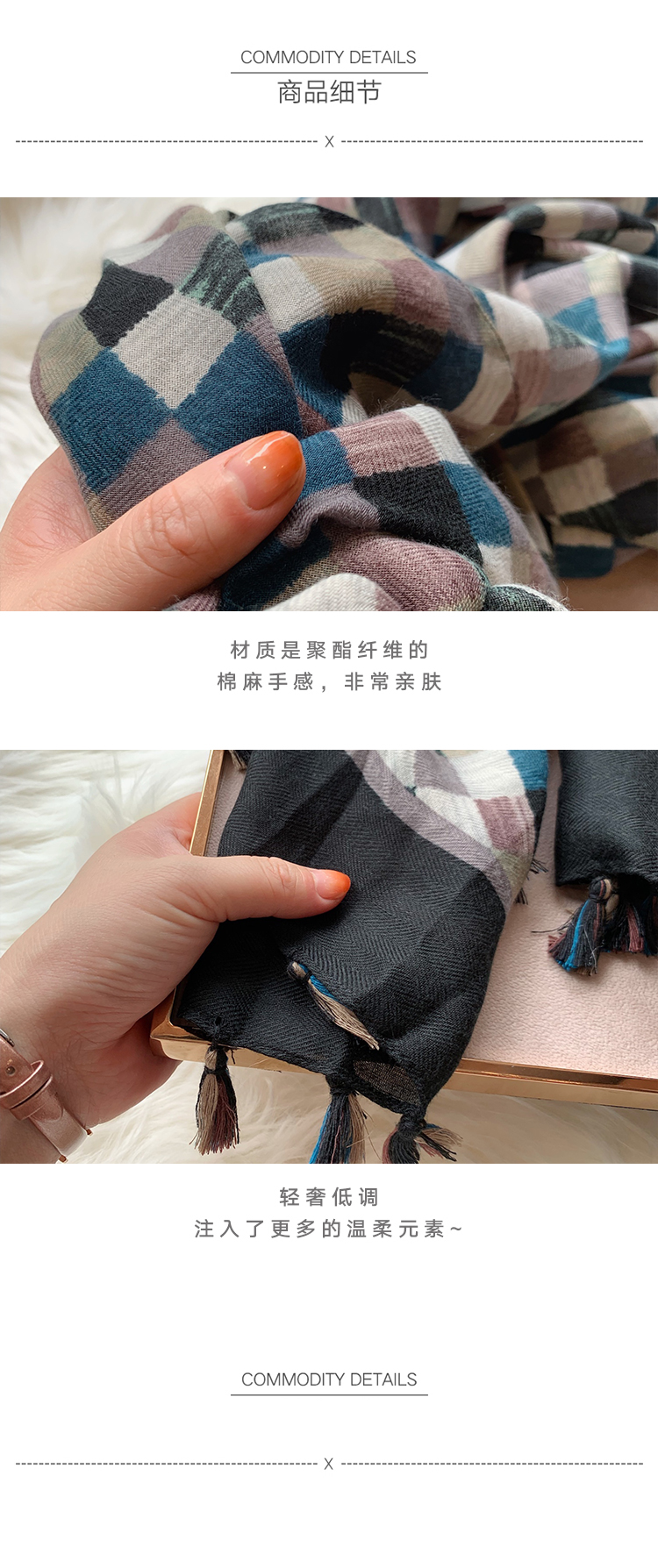 2019秋冬圍巾女冬季百搭薄款紗巾圍脖海邊防曬披肩拼色格子絲巾女1入