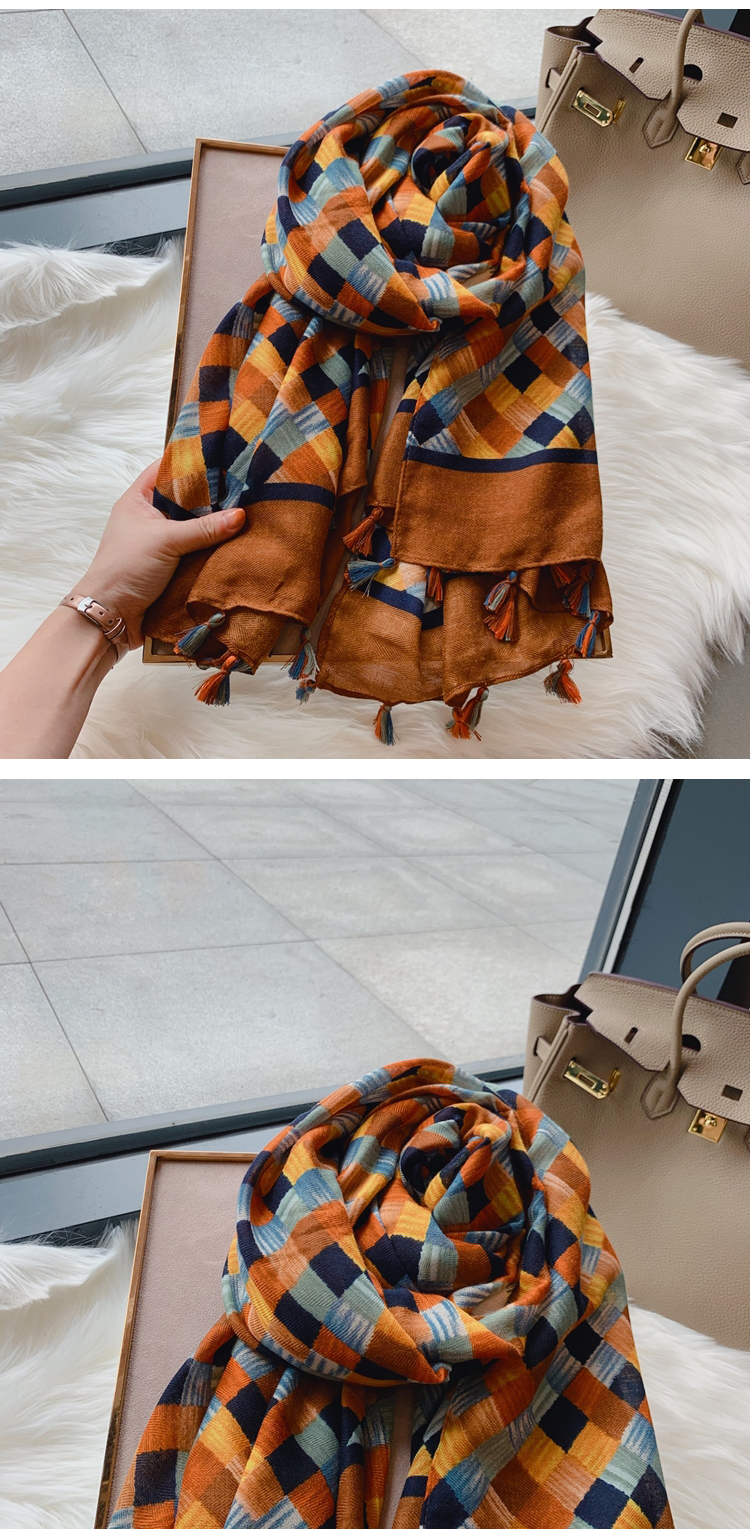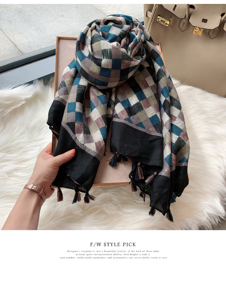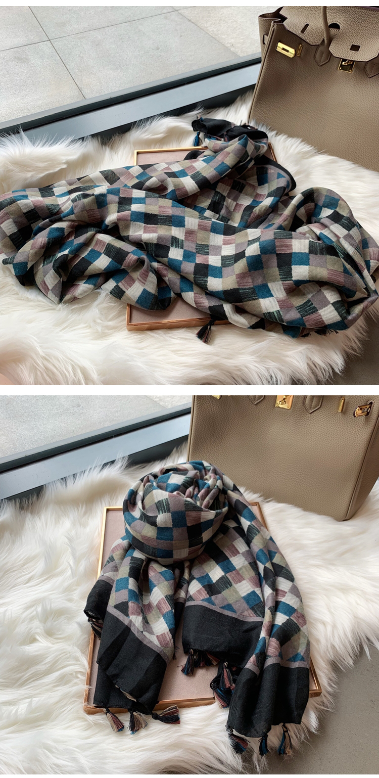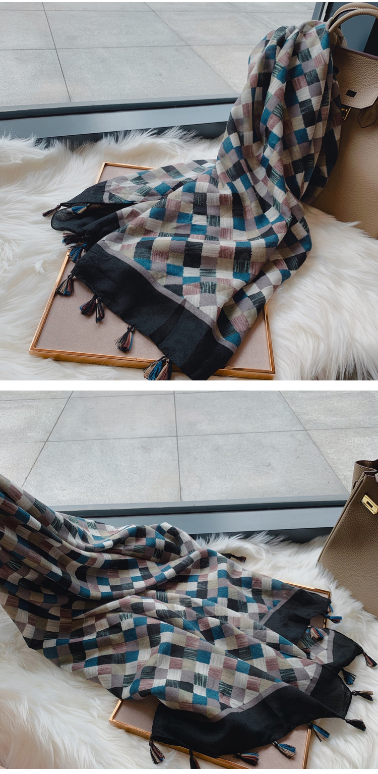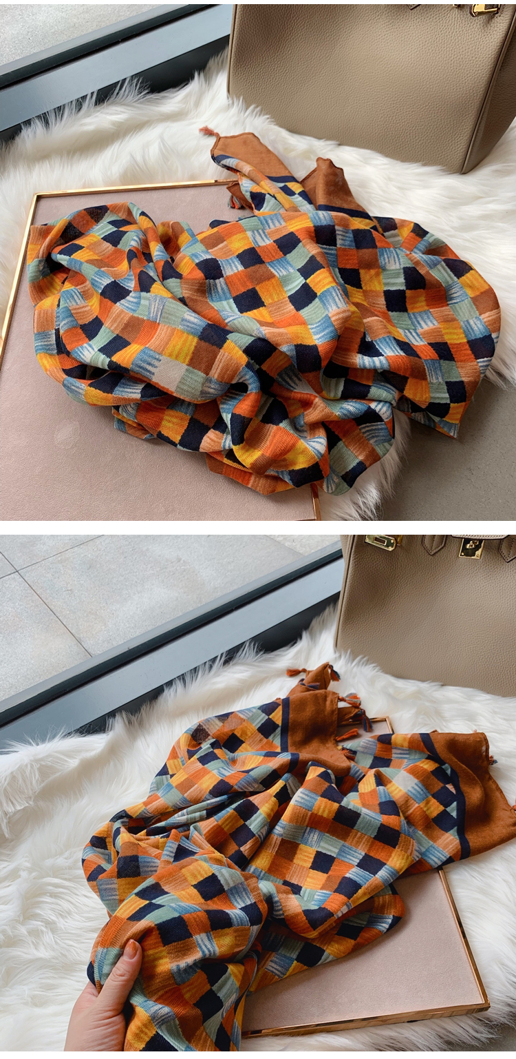 2019秋冬圍巾女冬季百搭薄款紗巾圍脖海邊防曬披肩拼色格子絲巾女1入
