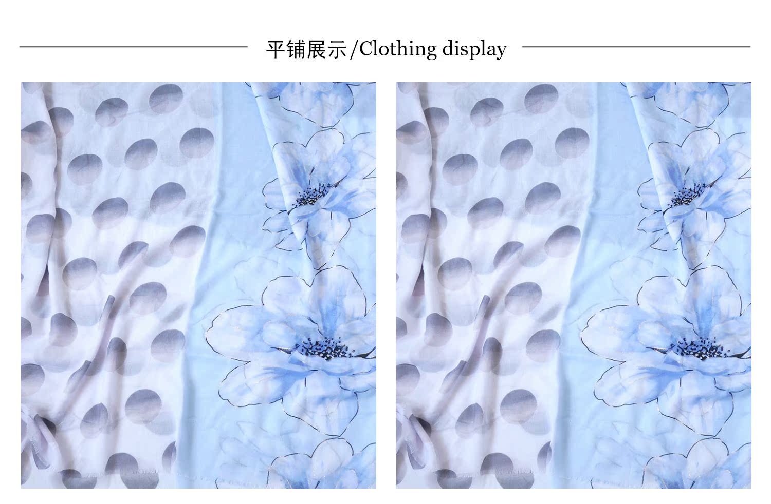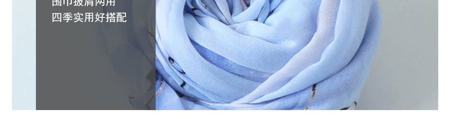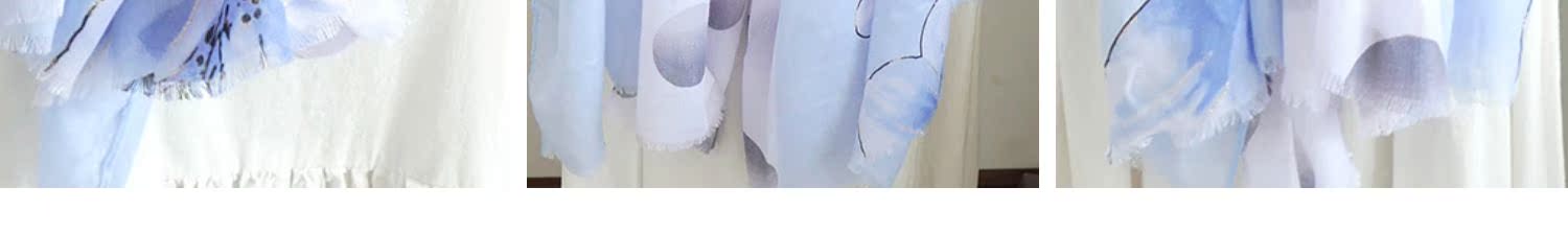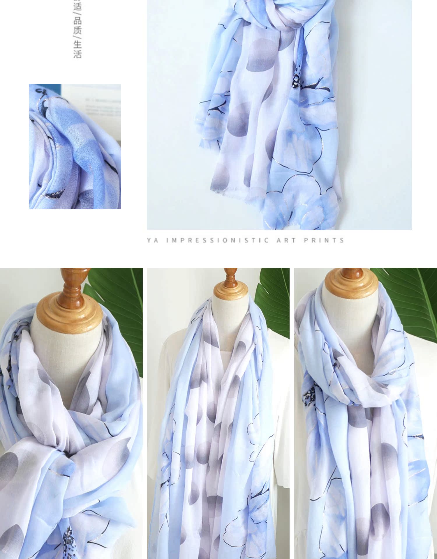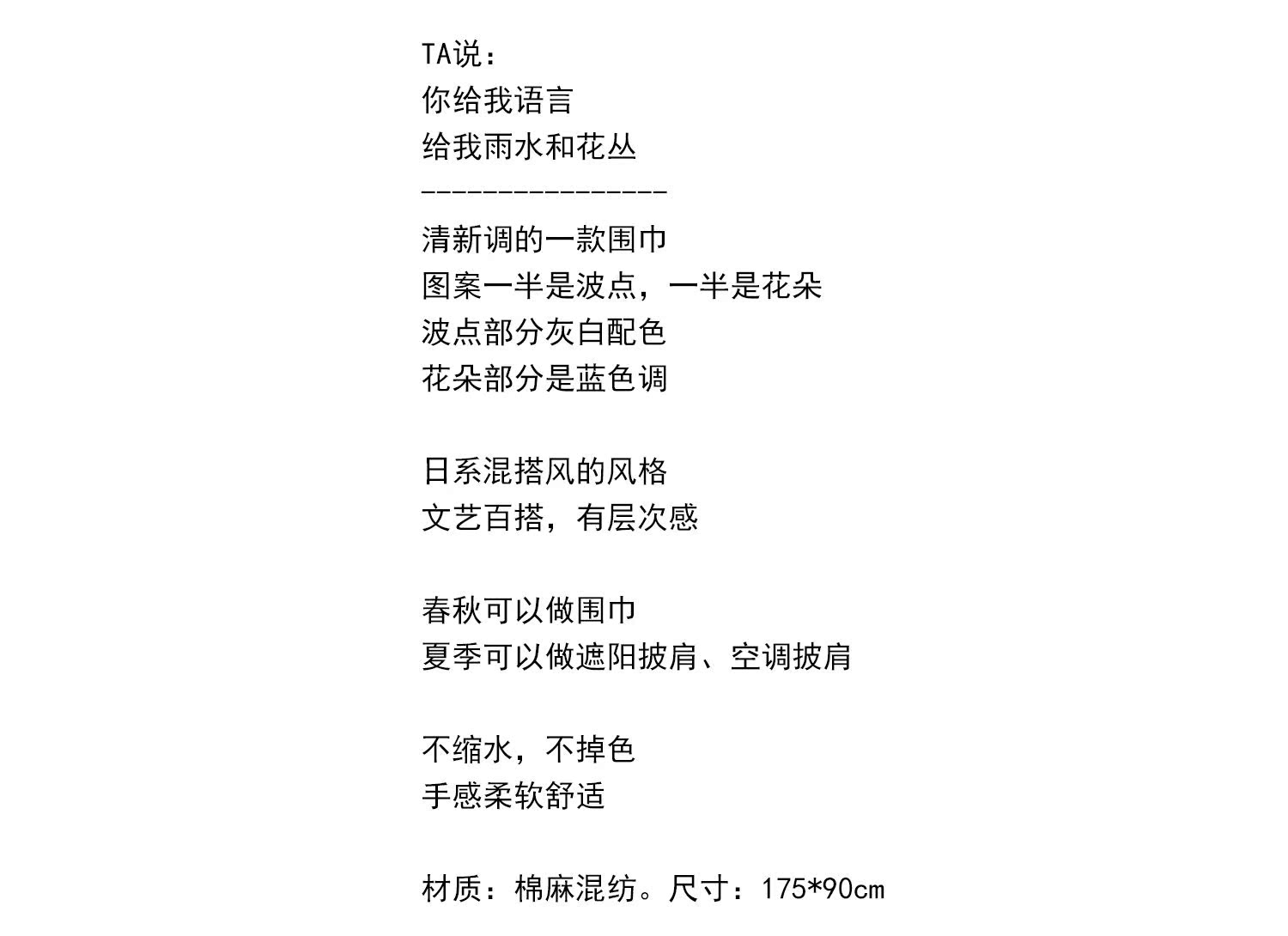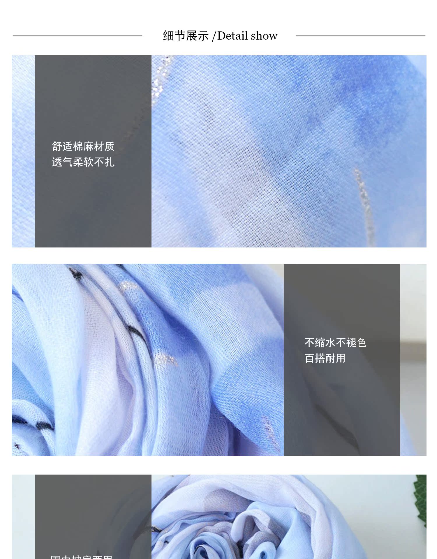 雨水和花叢 氣質淡藍棉麻圍巾女 波點花朵春秋絲巾 夏季遮陽披肩1入