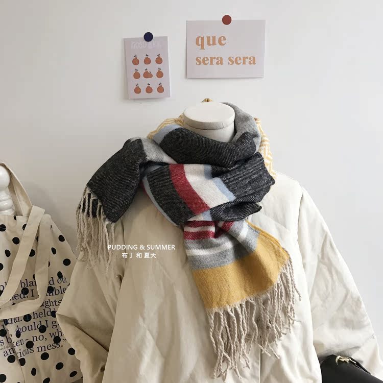 韓國東大門新款彩色條紋人紋撞色圍巾加長加厚圍巾流蘇保暖圍脖女1入
