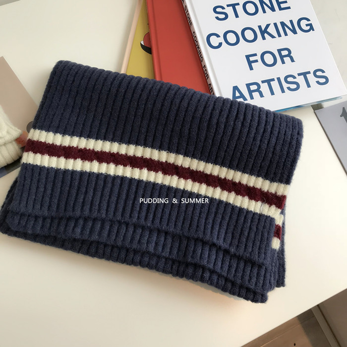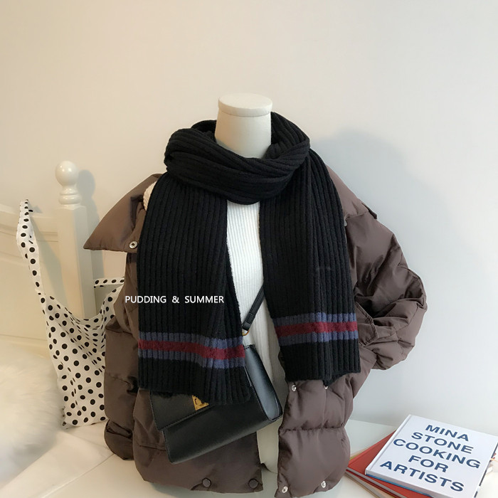 韓國2019年冬天新款學院風條紋拼色粗毛線圍巾加厚加長保暖情侶款1入