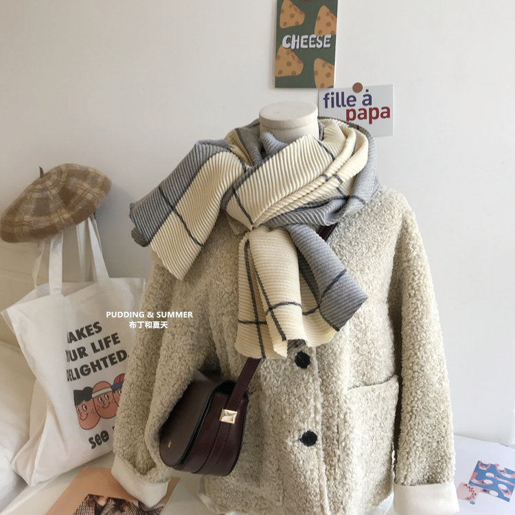 韓國東大門新款圍巾漸變格子撞色百搭圍脖保暖壓軸風琴紋女士披肩1入