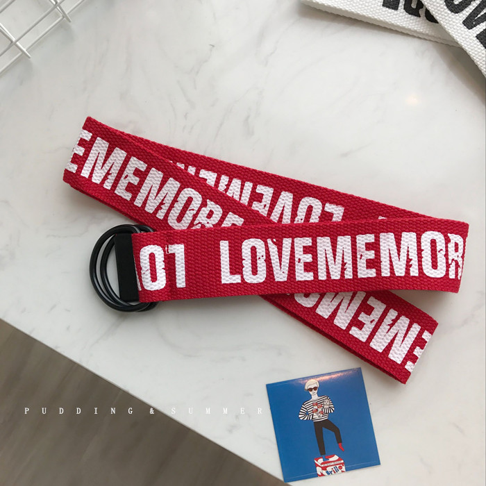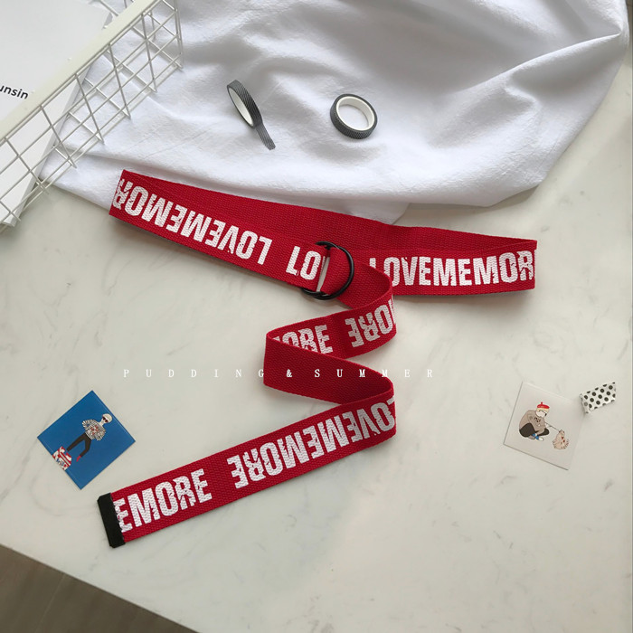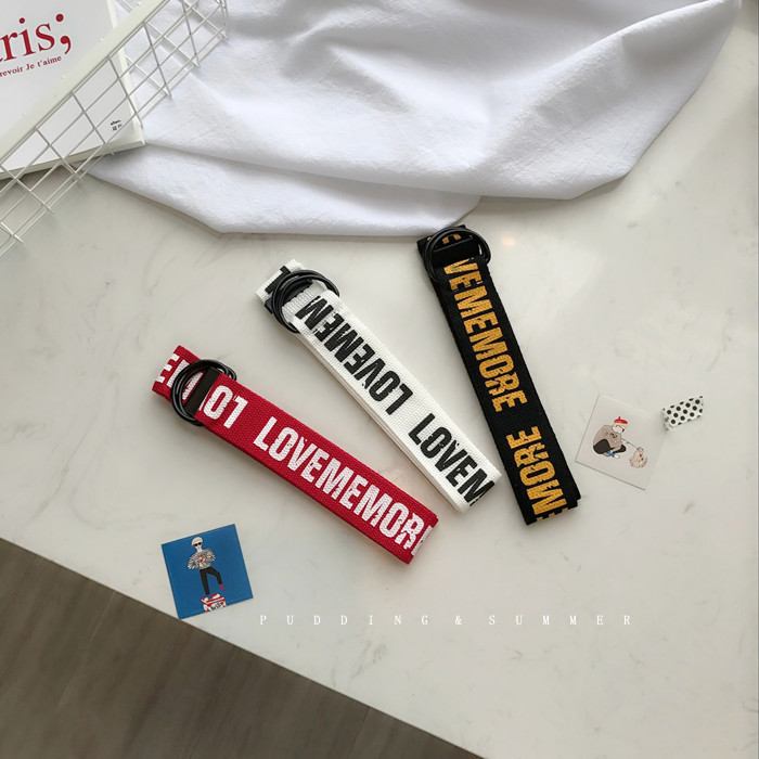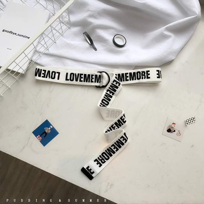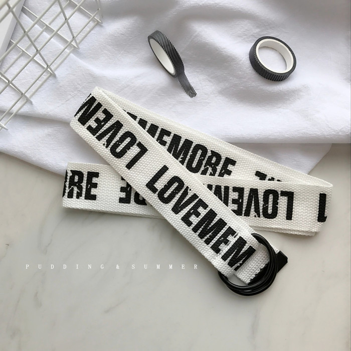 韓國東大門新款帆布腰帶做舊復古印花英文黑金屬雙環扣皮帶牛仔褲1入