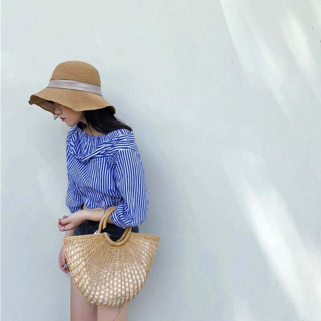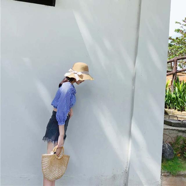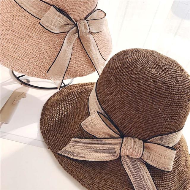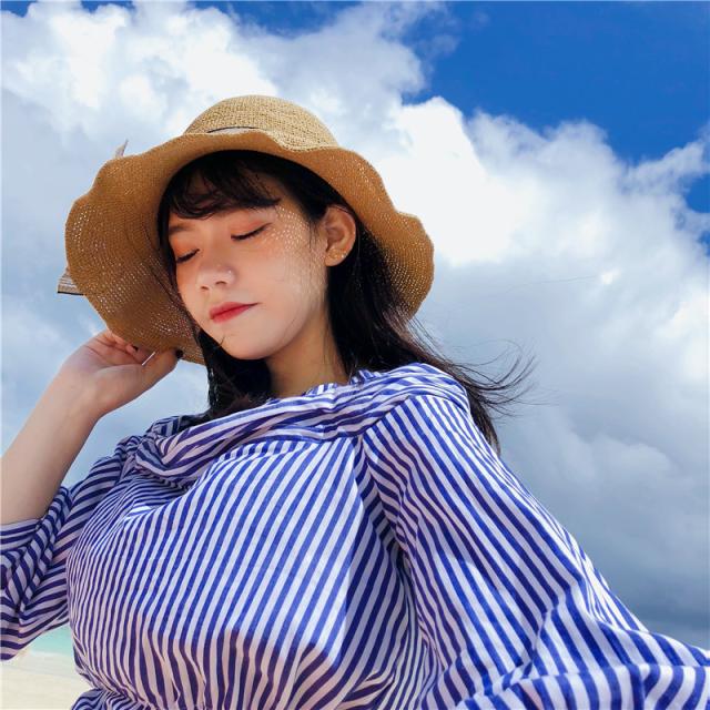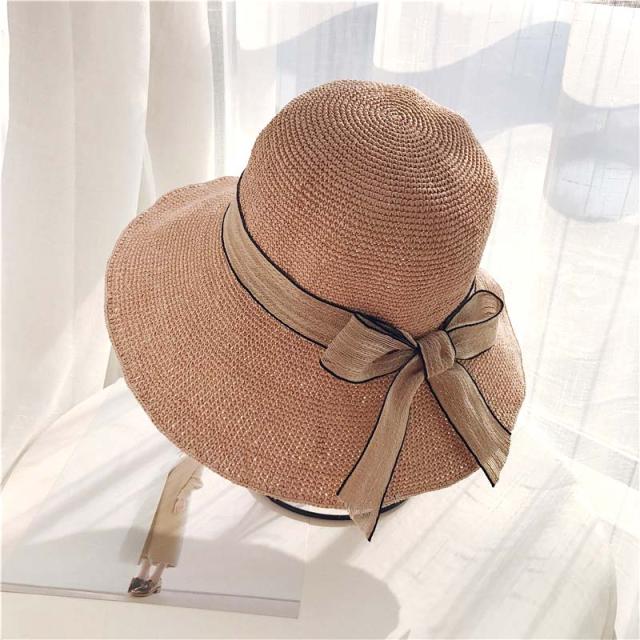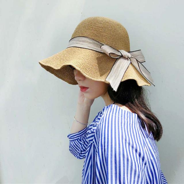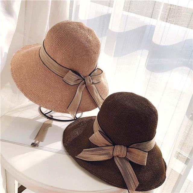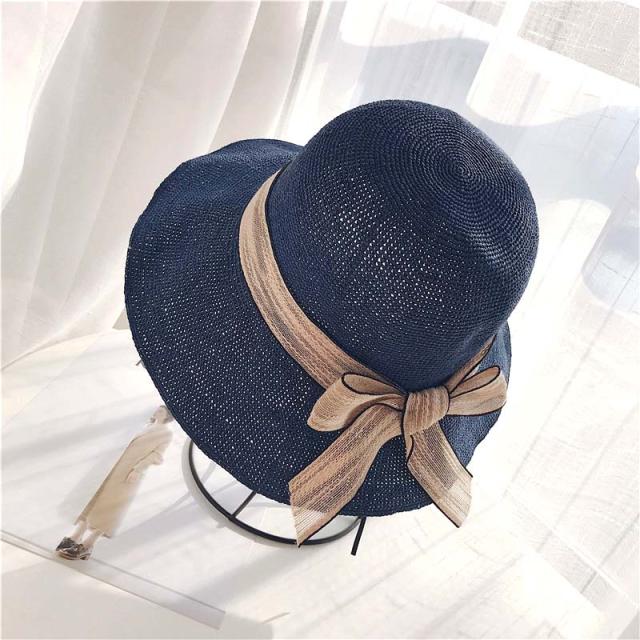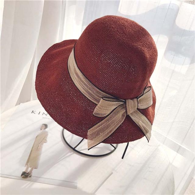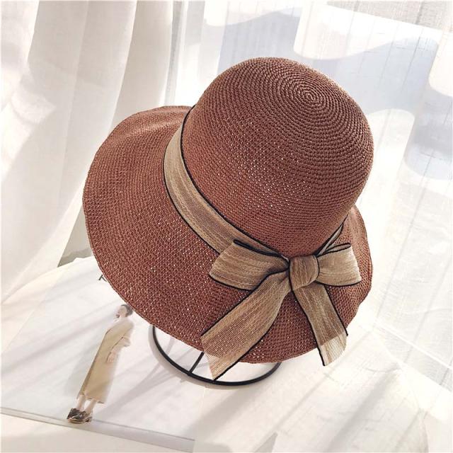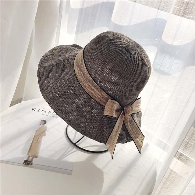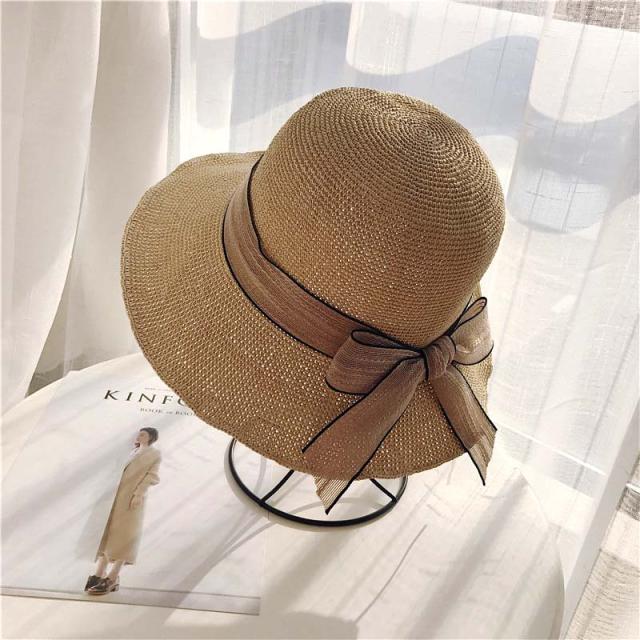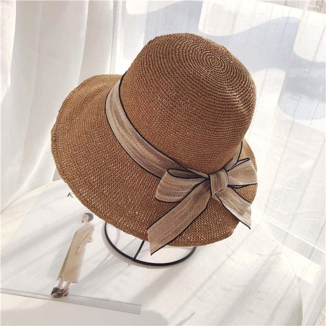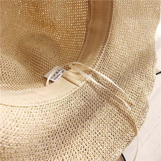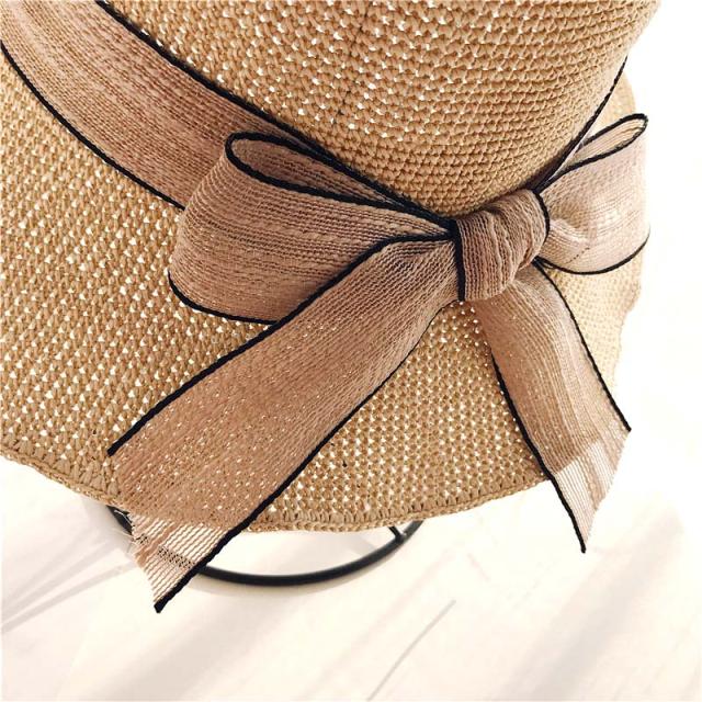 韓版夏季遮陽帽絲帶裝飾漁夫帽可折疊遮陽帽沙灘帽子休閑百搭草帽1入