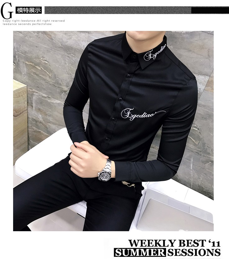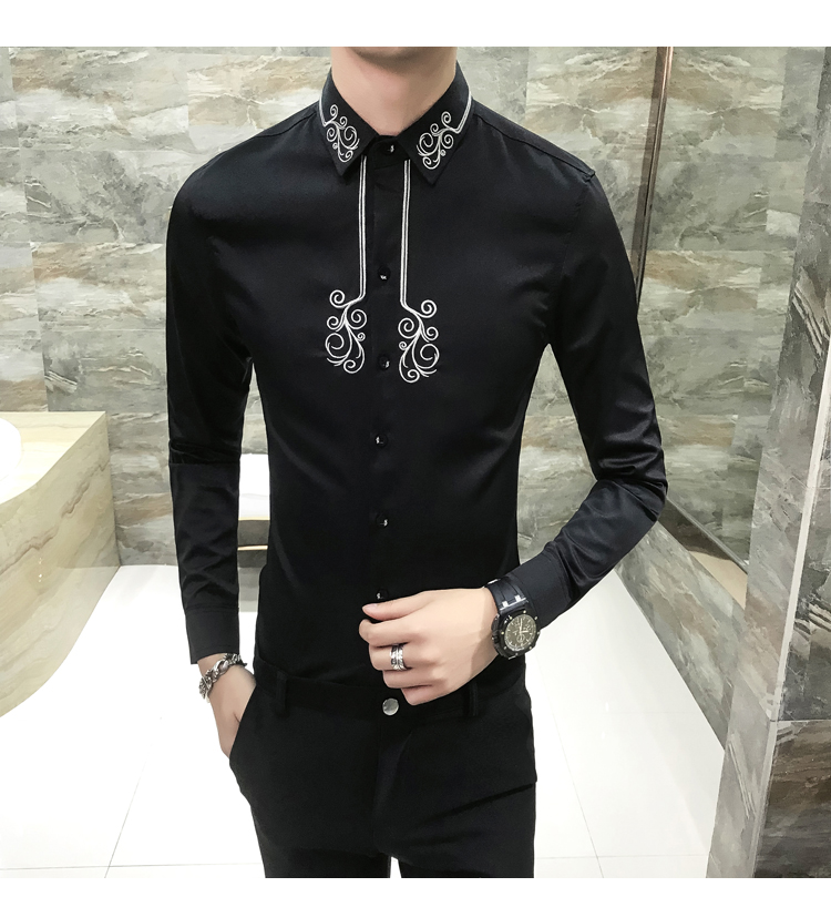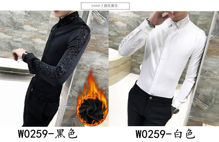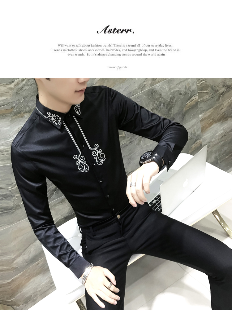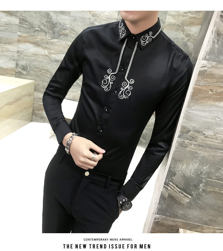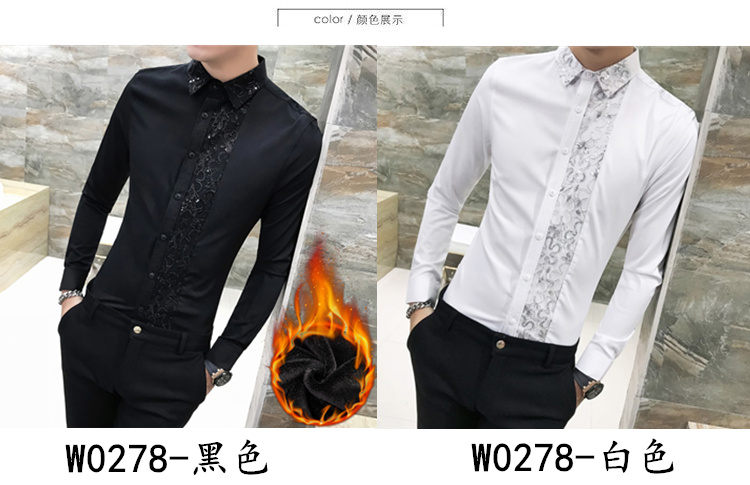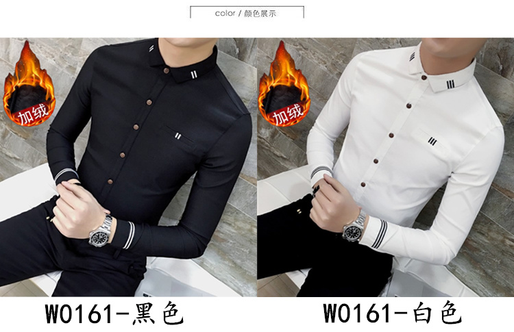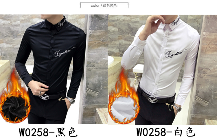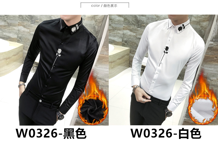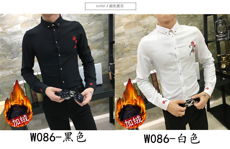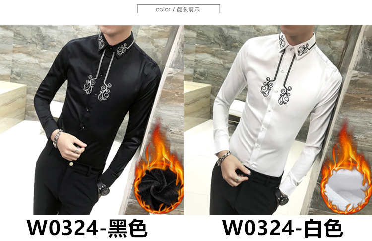 2019秋冬季保暖襯衫潮男韓版個性繡花長袖帥氣發型師修身加絨襯衣1入