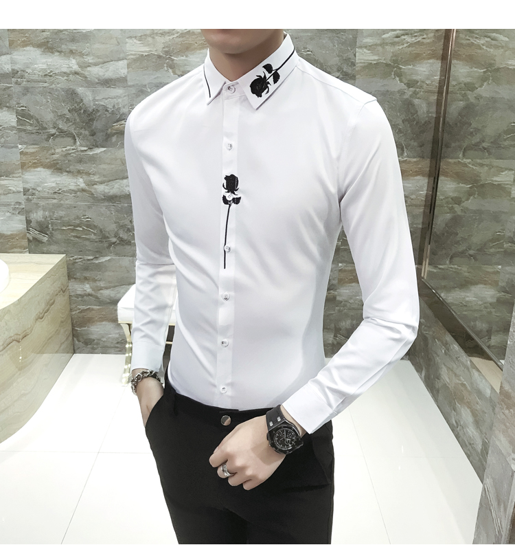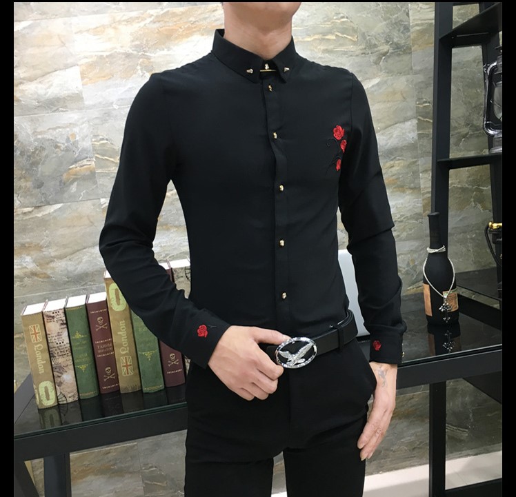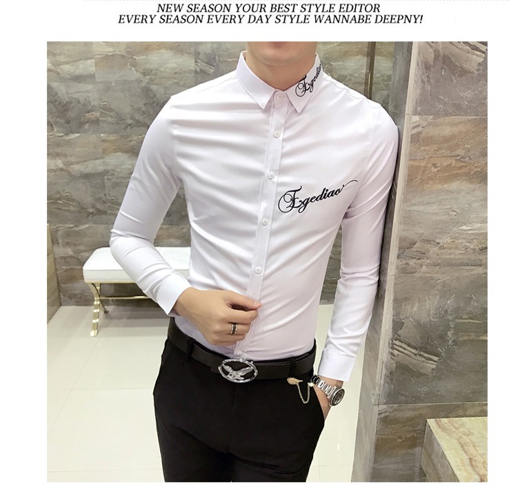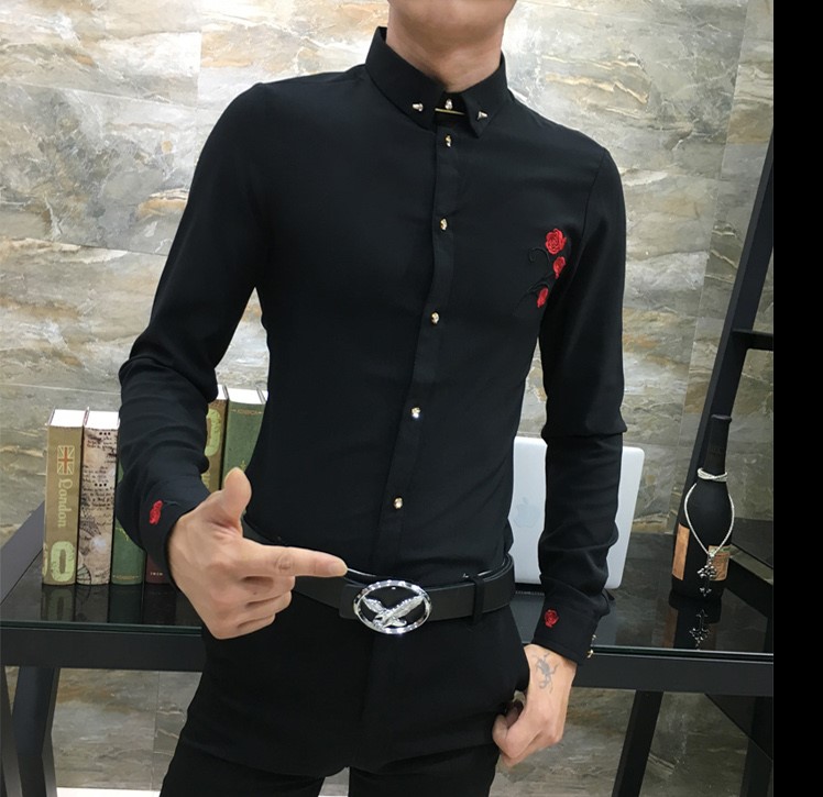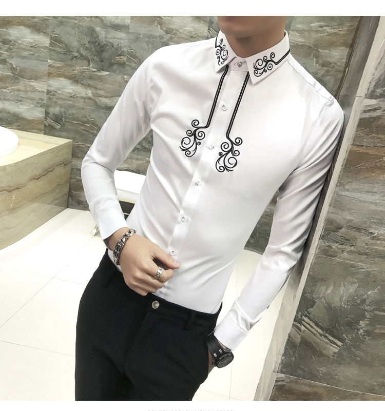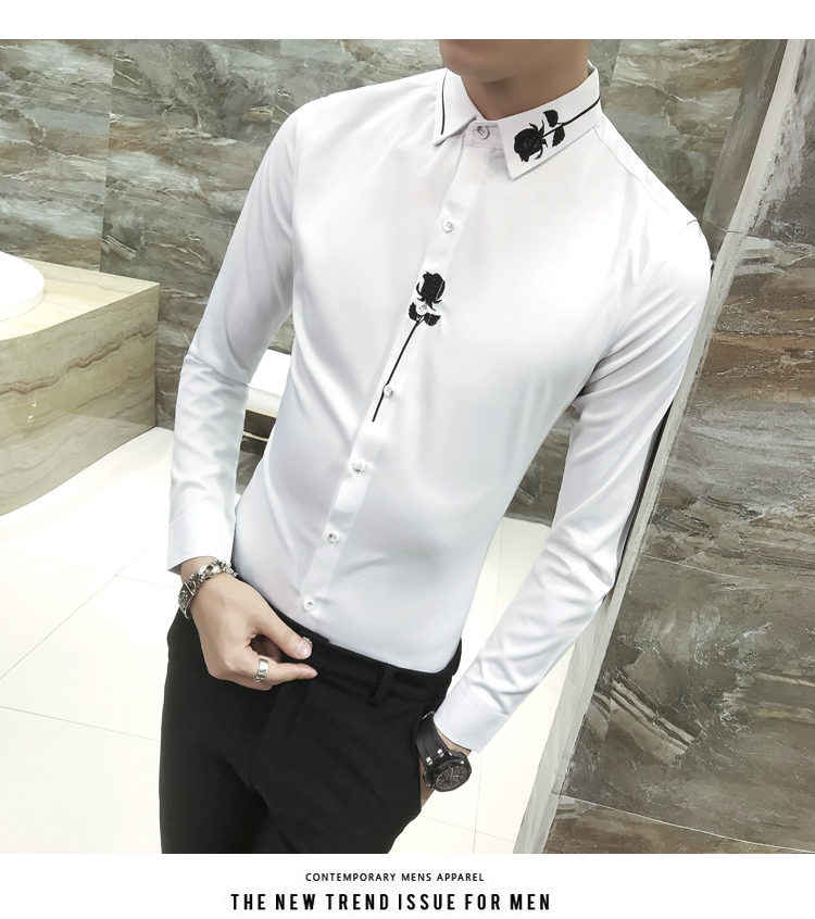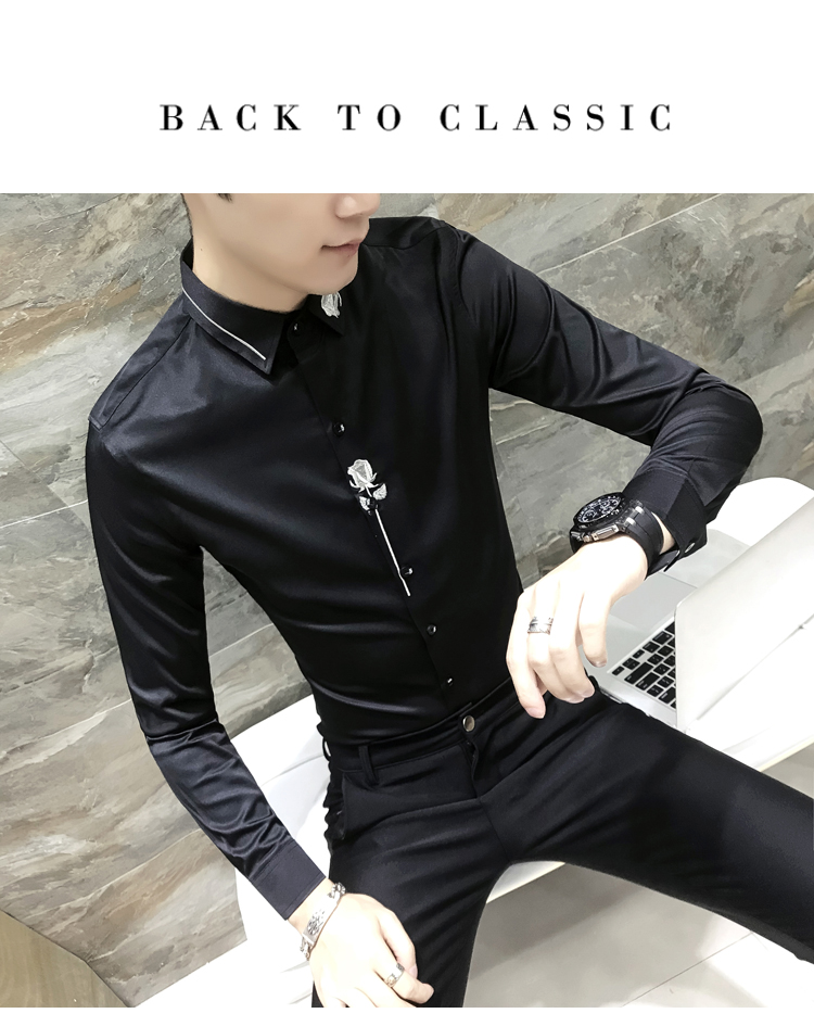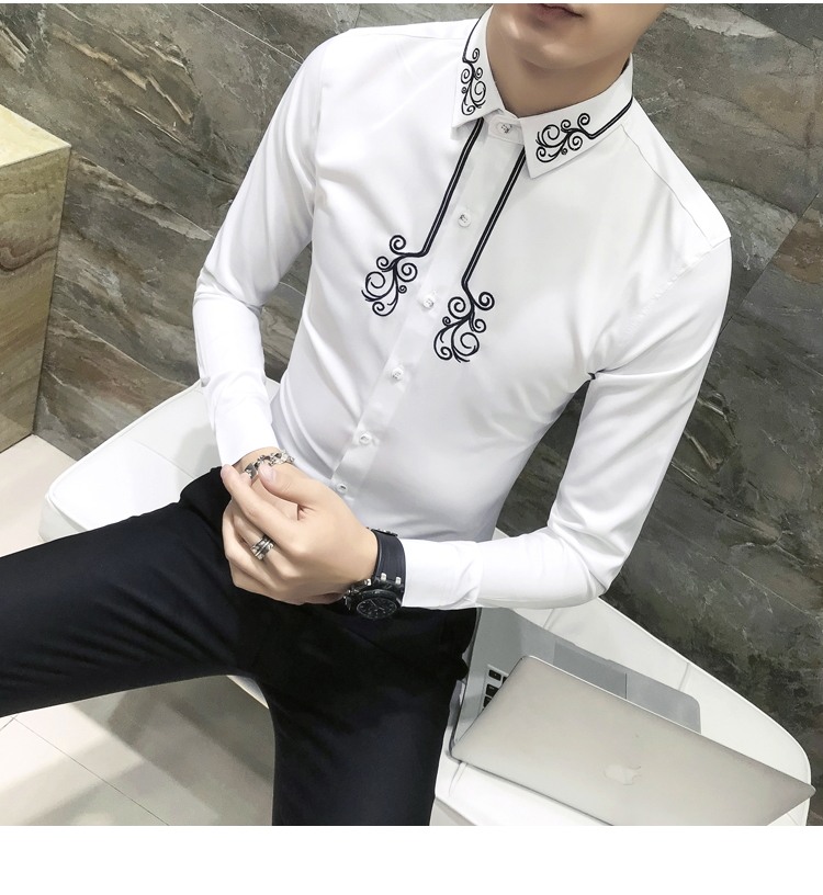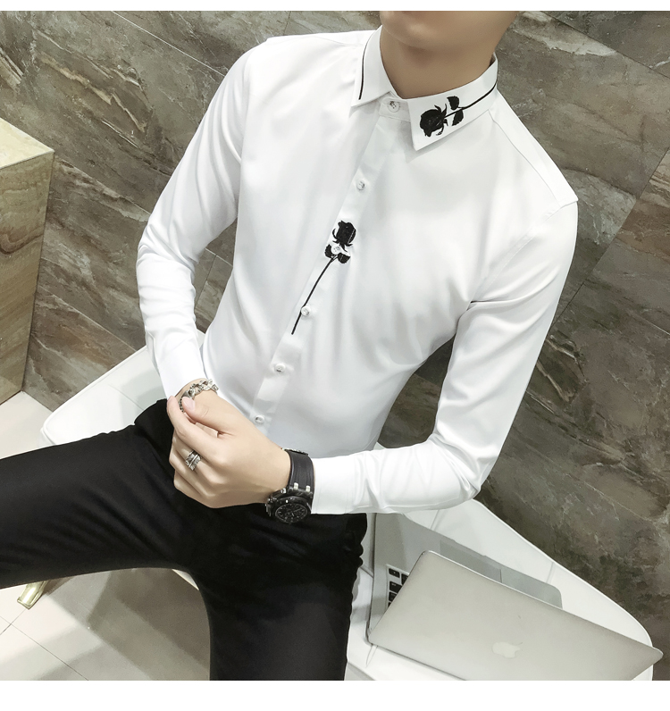 2019秋冬季保暖襯衫潮男韓版個性繡花長袖帥氣發型師修身加絨襯衣1入